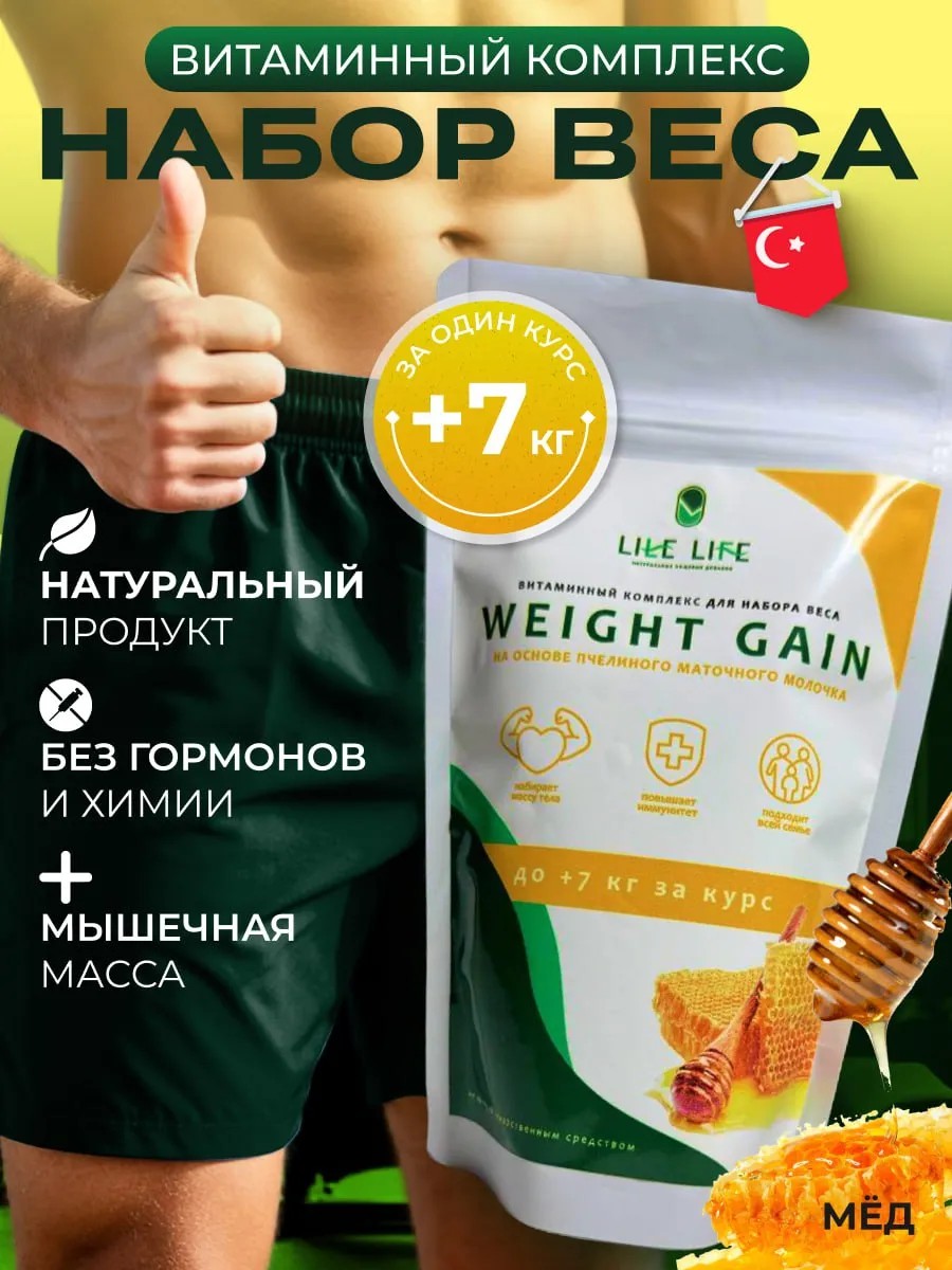 *LIFE LIFE WEIGHT GAIN* – это натуральный витаминный комплекс для набора веса и укрепления организма. Он безопасен, эффективен, подходит для всей семьи, помогает улучшить аппетит, повысить иммунитет и прибавить до *+7 кг за курс*. Благодаря сбалансированному составу на основе пчелиного маточного молочка, комплекс обеспечивает организм всеми необходимыми элементами для здоровья и активной жизни.