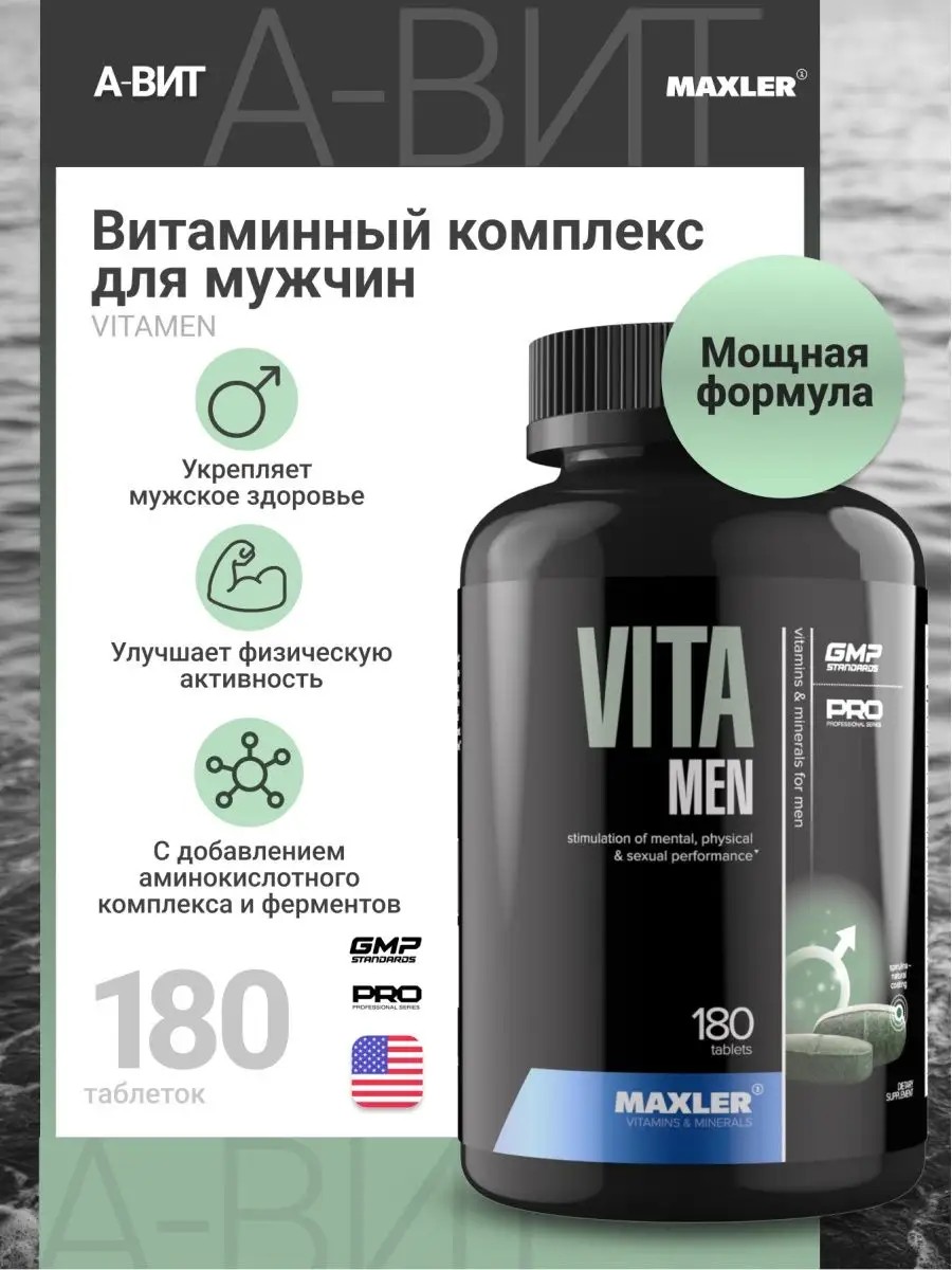 Созданный специально для мужчин витаминно-минеральный комплекс, состоящий из ключевых минералов и экзотических фитодобавок Maxler Vita Men / Макслер Вита Мен способствует улучшению умственной и физической активности, здоровью простаты, снижает негативные последствия стресса и нормализует функцию пищеварительной системы. Спортивные витамины для мужчин Maxler VitaMen снабжают ваш организм важными и быстроусваиваемыми аминокислотами, которые способствуют росту мышц и их восстановлению. Данный продукт содержит высокие спортивные дозировки витаминов. Рекомендуем принимать в утренний прием пищи за 10 часов до сна. Курс приема VitaMen: При высоких физических нагрузках и дефиците витаминов 4-6 недель 3 таблетки. При средних физических нагрузках и дефиците витаминов 4-6 недель 2 таблетки. Если вы принимаете продукт в профилактических целях, 2 недели не более 1 таблетки VitaMen в день. Рекомендуем принимать курсами 2-3 раза в год. Перед приемом продукта рекомендуем проконсультироваться с лечащим терапевтом.