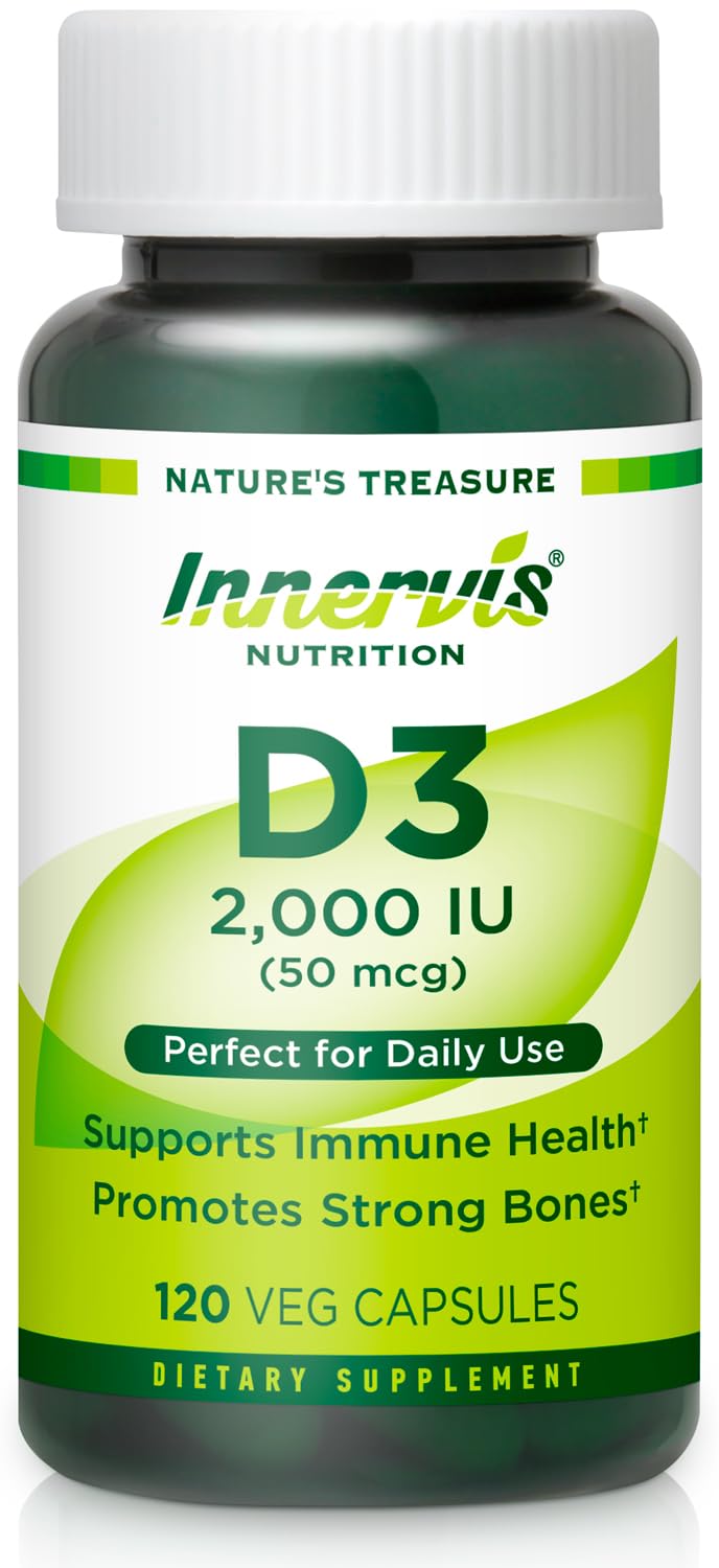 Innervis Nutrition Vitamin D3 2000 IU (50mcg) The Consistent Daily Support for Immune and Bone Health Innervis Nutrition provides the ideal strength of Vitamin D3—2000 IU (50mcg)—perfectly suited for daily integration into your wellness routine. For many, maintaining sufficient Vitamin D levels is a challenge. Our easy-to-take capsule helps ensure your body receives this vital nutrient every day for foundational support. The Key Benefits of Consistent Daily D3: Routine Immune Support: Regular, daily intake supports the body's natural ability to maintain a strong and balanced immune system. Foundational Bone Health: D3 is the cornerstone for calcium absorption, promoting the necessary mineralization to keep bones and teeth strong throughout life. Effortless Wellness: The single, small capsule dose is Perfect for Daily Use, providing continuous support for overall mood and physiological well-being. Purity, Reliability, and Value: Each bottle offers a generous 120-day supply of easy-to-swallow vegan capsules. Our commitment to quality ensures our product is manufactured in a made in the USA with no unnecessary additives. These statements have not been evaluated by the Food and Drug Administration. This product is not intended to diagnose, treat, cure, or prevent any disease.
