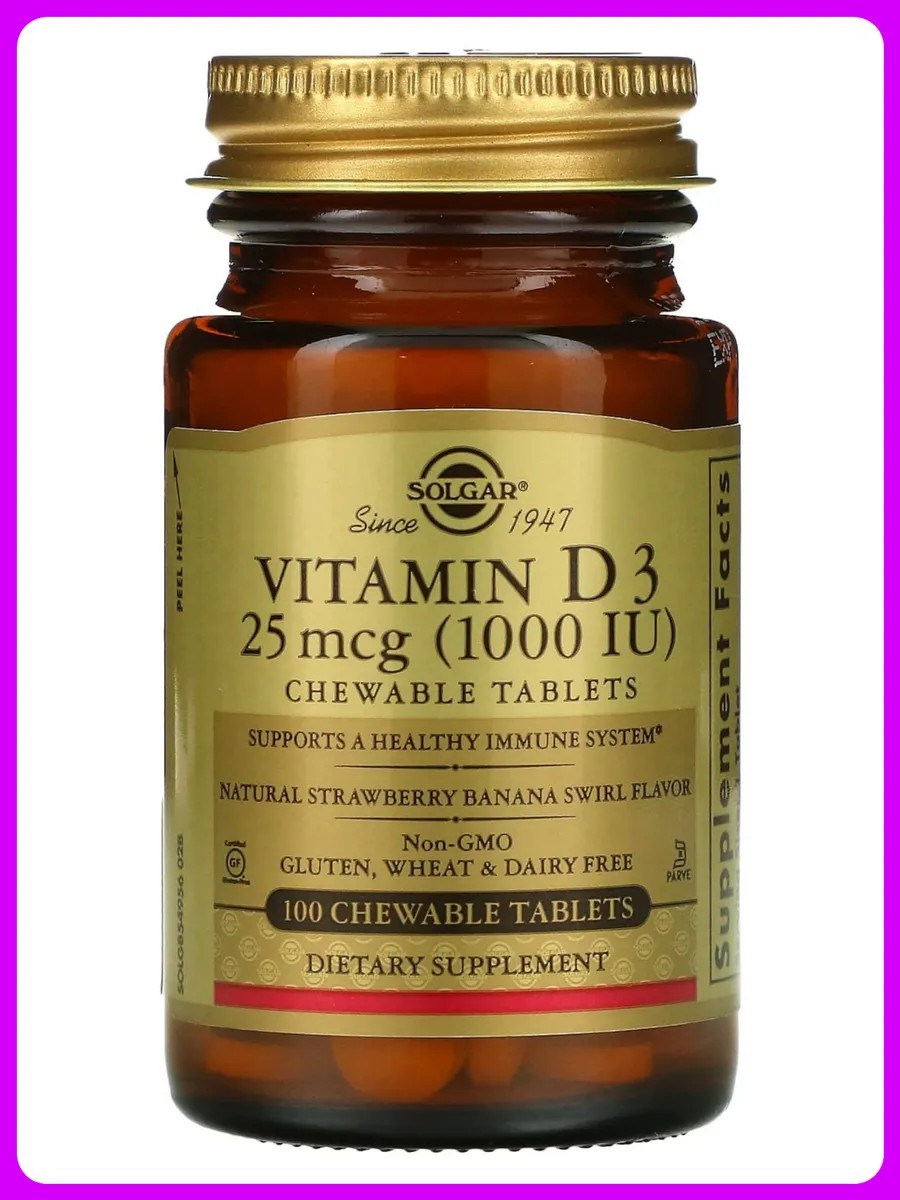Витамин D3 в дозировке 25 мкг (1000 МЕ), имеет натуральный клубнично-банановый вкус.