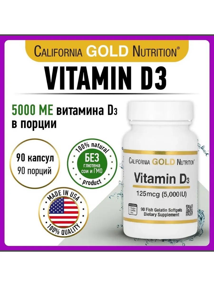 Витамин D3 (125 мкг / 5000 МЕ) от California Gold Nutrition — это добавка с витамином D в виде холекальциферола в капсулах из рыбьего желатина.