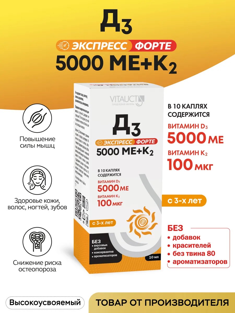 Д3 Экспресс Форте 5000 МЕ+К2 от VITAUCT — масляный раствор БЕЗ консервантов, ароматизаторов, вкусовых добавок и др.