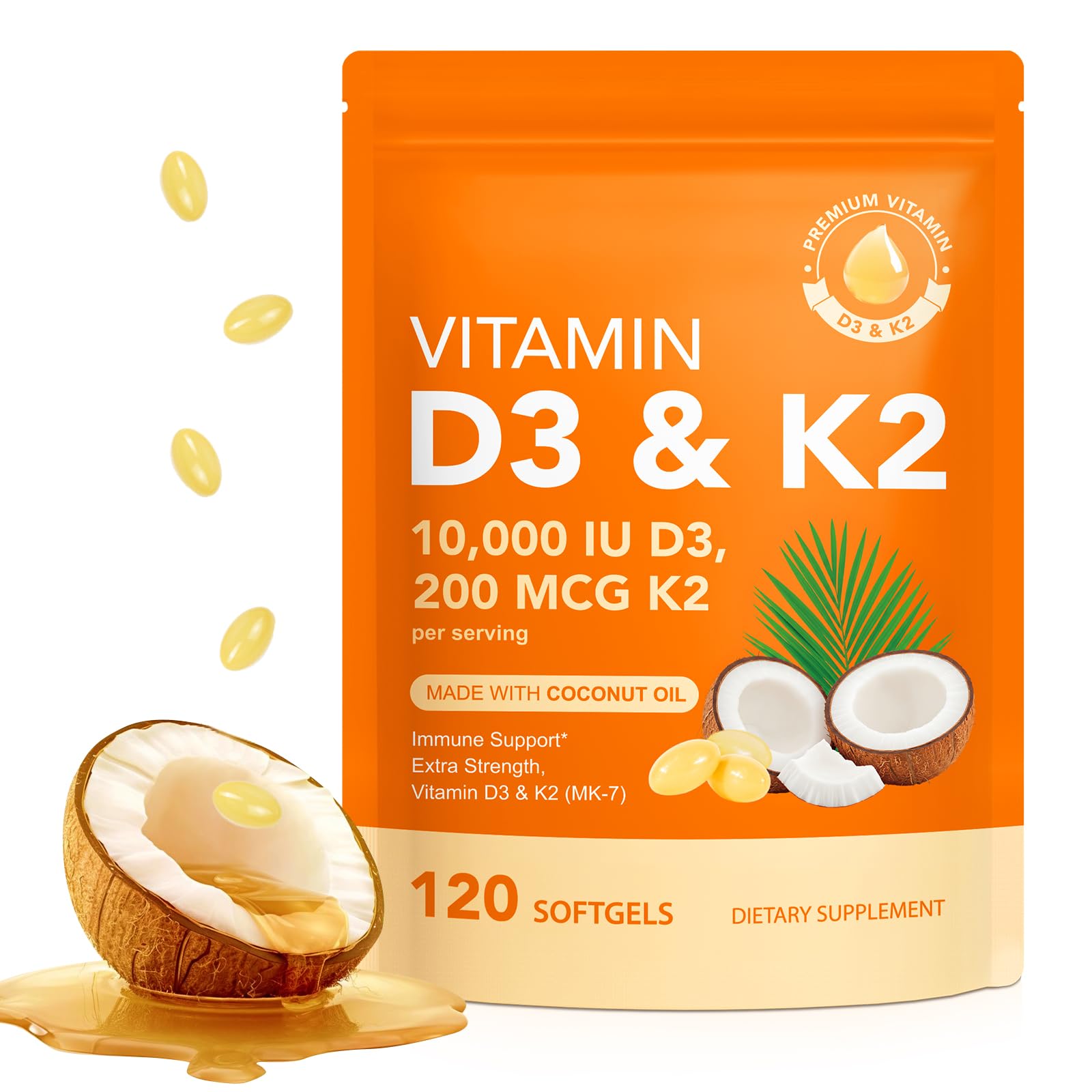 Vitamin D3 K2 10000 IU with 200mg, Vitamin D3 and K2 Capsules, 2 in 1 Vitamins D K Complex with Virgin Coconut Oil, 120 Softgels, Easy to Swallow