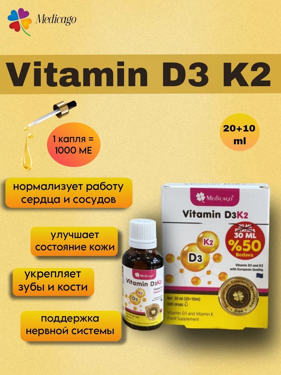 Витамин Д3 К2 это биологически активная добавка, специально разработанная для укрепления здоровья и улучшения состояния жизни человека. Жидкая форма содержит в своем составе вит д3 + к2 1000 ме в каждой капле.