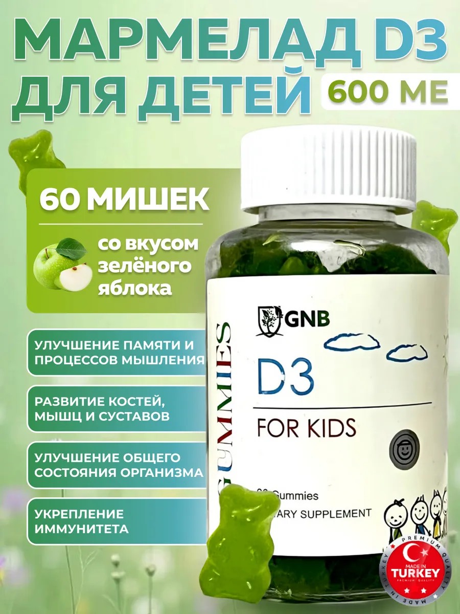Витамин D3 мармелад для детей и взрослых — это вкусный и удобный способ восполнить дефицит витамина D3, который так важен для здоровья костей, зубов и иммунитета. Жевательные мармеладные мишки, бады для подростков и малышей помогут позаботиться о здоровье в период простудных заболеваний, при несбалансированном питании, во время умственных и физических нагрузок, при адаптации ребенка в новых условиях, на фоне ежедневного стресса, способствуют профилактике здоровья. Этот мармелад не содержит ГМО, глютена и лактозы, что делает его подходящим для людей с различными пищевыми ограничениями. Витамин D3 помогает организму усваивать кальций, что важно для формирования и поддержания крепких костей. Откройте для вашего ребенка источник солнца и счастья с витамином Д3 мармелад для детей в форме медвежат! Каждая порция этого вкусного и веселого лакомства не только радует сладким вкусом, но и заботится о здоровье вашего чада. Специально разработанная форма медвежат вызывает у детей интерес и желание принимать полезные витамины ежедневно. Забудьте о капризах и слезах — теперь прием витаминов становится настоящей игрой! Эти ароматные мармеладные мишки станут любимым лакомством вашего малыша, помогая сформировать хорошие привычки с раннего возраста. Не упустите шанс подарить вашему ребенку гармонию и здоровье с витамином Д3 в самой вкусной и удобной форме! Ведь заботиться о своих детях никогда не было так вкусно и легко.Каждая порция мармелада содержит 400 МЕ витамина D3, что соответствует рекомендуемой суточной дозе для большинства людей.