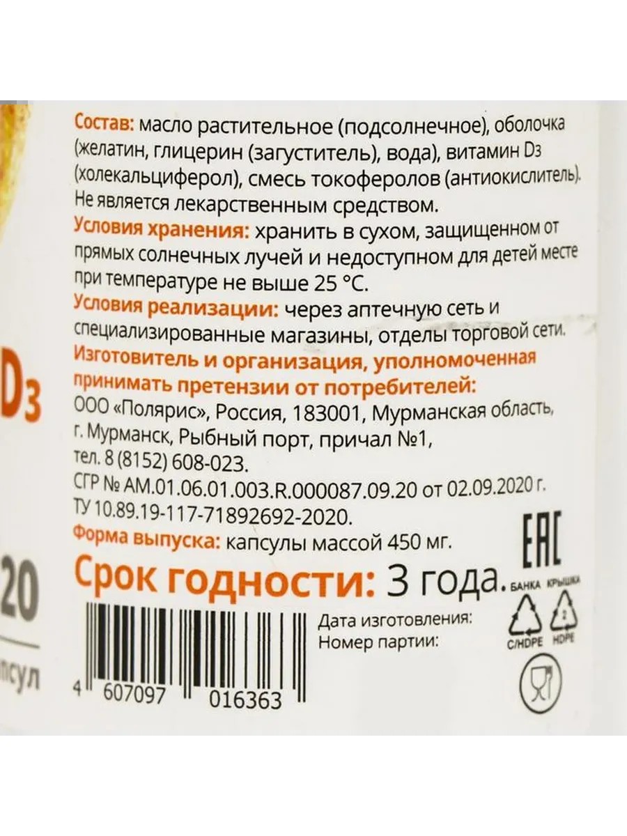 The course of treatment is one month, and can be repeated throughout the year if necessary. This complex is not a medicine and is intended to prevent vitamin D3 deficiency.