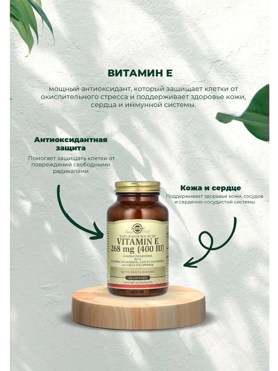 Витамин E обеспечивает питательную поддержку иммунной системы. Он помогает бороться со свободными радикалами, которые вызывают повреждения и окислительный стресс в организме, что может способствовать преждевременному старению клеток. Это средство является натуральным источником витамина E в виде d-альфа-токоферола, а также смешанных токоферолов, включая d-гамма-, d-дельта- и d-бета-токоферолы.