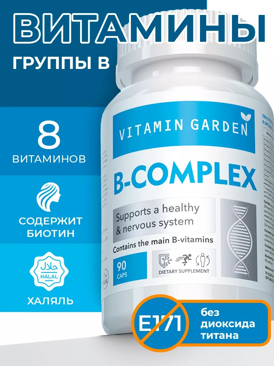 B-Complex — комплексная биодобавка, содержащая полный спектр витаминов группы B: B1 -тиамин - для энергии, B2 - рибофлавин - для красоты, B3 (PP) — ниацин (или никотиновая кислота) - для синтеза и обмена вещества, B5 — пантотеновая кислота (в форме пантотената кальция) - для восстановления кожи после порезов, B6 — пиридоксин - для нервов, B7 — биотин (витамин Н) - для красивой кожи, B9 — фолиевая кислота - женский витамин, B12 — цианокобаламин - от анемии. Не содержат глютена и лактозы, генетически-модифицированных продуктов. Легко усваиваются организмом. Дозировка покрывает суточную потребность в витамине B, но не превышает максимально рекомендованную дозу дневного потребления. Витамины группы Б незаменимы для нормальной работы иммунитета. Полезны в период сезона простуды, гриппа и ОРВИ, поддерживают иммунную систему, повышают сопротивляемость вирусам и бактериям. Подходит для женщин, мужчин и подростков. Витаминный комплекс необходим для улучшения состояния кожи, волос и ногтей. Он останавливает выпадение волос, стимулируя их рост, делает гладкими и шелковистыми, помогает избавиться от эффекта «пушистости». При регулярном приёме витаминов отрастают здоровые и крепкие ногти, не подверженные расслоению. Витамины группы B благотворно влияют на нервную систему. Помогают организму избавиться от стресса, хронической усталости, раздражительности и вспышок гнева. Мультивитамины помогают справиться с физическими и моральными нагрузками, улучшают настроение, наполняют энергией и силой для преодоления новых испытаний. B Complex помогает в усваивании других витаминов и минеральных добавок, в том числе железа. Его можно принимать в сочетании с другими пищевыми добавками нашего бренда. Рекомендации по применению для взрослых, в том числе женщинам, планирующим беременность, беременным и кормящим женщинам: по 1 капсуле в день во время еды. Лучше пить биодобавки в первой половине дня, чтобы избежать проблем с засыпанием. Беременным и кормящим женщинам принимать только по рекомендации и под наблюдением врача. БАД. Не является лекарственным средством. При сочетании с лекарственными препаратами проконсультируйтесь со своим лечащим врачом. Имеется сертификация по стандарту «Халяль».