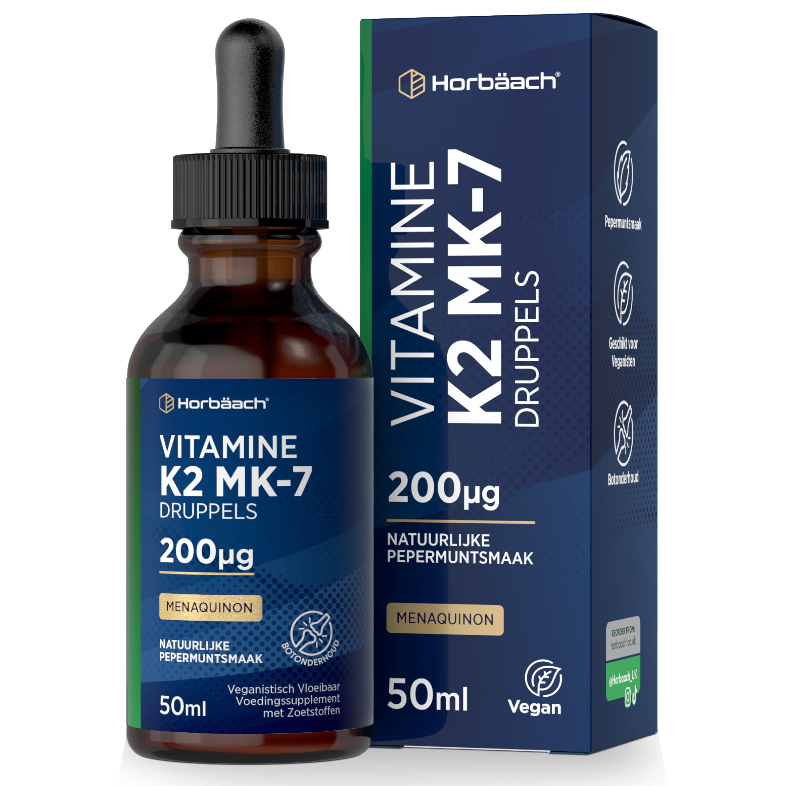 Vitamin K2: Vitamin K2 is an important nutrient that plays a crucial role in the body's ability to utilize calcium and ensure it is directed to the right places. The MK-7 form of vitamin K2, also known as menaquinone-7, is one of the most bioavailable forms of vitamin K2. One of the easiest and most practical ways to increase vitamin K2 intake is through dietary supplements. With a wide variety of options – such as liquid drops, sprays, capsules, chewable tablets, softgels and powders – it's easy to find the perfect size to fit your lifestyle. Horbaach Vitamin K2 MK-7: A smarter way to supplement! This advanced formula delivers 200 µg of vitamin K2 in a super convenient liquid form, making it effortless to integrate into everyday life. Perfect for men and women – simply take 10 drops daily to get the most from this powerful nutrient. INGREDIENTS Water, Sweeteners (Sorbitol Syrup, Xylitol), Vitamin K (Menaquinone), Thickener (Xanthan Gum), Acid (Citric Acid), Preservative (Potassium Sorbate), Natural Peppermint Flavouring. INSTRUCTIONS FOR USE Shake well before use. Take 10 drops per day diluted with a glass of water with a meal. SAFETY WARNING Food supplements should not be used as a substitute for a varied and balanced diet and a healthy lifestyle. If you are pregnant, nursing, taking medication, or have a medical condition, consult your physician or healthcare provider before use. If any side effect occurs, stop using this product immediately and consult your doctor. It is not intended for use by persons under the age of 18. See morePackaging may vary: We are in the process of updating our packaging. If the product you receive looks different, you can be assured that the benefits remain the same. Additionally, if your product is labeled in English, you will find a removable label with six additional languages for your convenience. SUITABLE FOR: Horbaach Vitamin K2 MK-7 liquid is vegetarian and vegan – the perfect formula for adult men and women, and at excellent value for money. SIMPLE DROPS: Say goodbye to hard-to-swallow tablets! Just 10 drops per day will help you enjoy the great benefits of this nutritional supplement. MENAQUINON-7: The MK-7 form of vitamin K2 is absorbed particularly efficiently by the body. HIGH STRENGTH: Boost your well-being with our Vitamin K2 MK-7 drops, which are specially formulated to support your overall health. This highly bioavailable form of Vitamin K2 – MK-7 – provides 200 µg (270 NRV) of Vitamin K2 per recommended daily dose.Vitamine K2 MK-7 Druppels 200µg per Dagelijkse Dosis 50 ml Veganistische Vloeistof Natuurlijke Pepermuntsmaak van Horbaach Vitamine K2: Vitamine K2 is een belangrijke voedingsstof die een cruciale rol speelt bij het vermogen van het lichaam om calcium te benutten en ervoor te zorgen dat het naar de juiste plaatsen wordt geleid. De vorm MK-7 van vitamine K2, ook bekend als menaquinon-7, is een van de biologisch meest beschikbare vormen van vitamine K2. Een van de eenvoudigste en meest praktische manieren om de inname van vitamine K2 te verhogen, is via voedingssupplementen. Met een grote verscheidenheid aan opties – zoals vloeibare druppels, sprays, capsules, kauwtabletten, softgels en poeders – is het gemakkelijk om het perfecte formaat te vinden dat past bij jouw levensstijl. Horbaach Vitamine K2 MK-7: Een slimmere manier om te suppleren! Deze geavanceerde formule levert 200 µg vitamine K2 in een superhandige vloeibare vorm, waardoor het moeiteloos in het dagelijks leven kan worden geïntegreerd. Perfect voor mannen en vrouwen – neem gewoon dagelijks 10 druppels om optimaal te profiteren van deze krachtige voedingsstof. INGREDIËNTEN Water, Zoetstoffen (Sorbitolstroop, Xylitol), Vitamine K (Menachinon), Verdikkingsmiddel (Xanthaangom), Voedingszuur (Citroenzuur), Conserveermiddel (Kaliumsorbaat), Natuurlijk pepermunt aroma. GEBRUIKSAANWIJZING Goed schudden vóór gebruik. Neem 10 druppels per dag verdund met een glas water bij een maaltijd. VEILIGHEIDSWAARSCHUWING Voedingssupplementen mogen niet worden gebruikt als vervanging voor een gevarieerde en evenwichtige voeding en een gezonde levensstijl. Als u zwanger bent, borstvoeding geeft, medicijnen gebruikt of een medische aandoening heeft, raadpleeg dan vóór gebruik uw arts of zorgverlener. Als er een bijwerking optreedt, stop dan onmiddellijk met het gebruik van dit product en raadpleeg uw arts. Het is niet bedoeld voor gebruik door personen jonger dan 18 jaar. Meer bekijkenDe verpakking kan variëren: We zijn bezig onze verpakking te vernieuwen. Als het product dat u ontvangt er anders uitziet, kunt u er zeker van zijn dat de voordelen hetzelfde blijven. Bovendien vindt u, als uw product in het Engels is geëtiketteerd, voor uw gemak een afneembaar etiket met zes extra talen. GESCHIKT VOOR: Horbaach Vitamine K2 MK-7 vloeistof is vegetarisch en veganistisch – de perfecte formule voor volwassen mannen en vrouwen, en dat tegen een uitstekende prijs-kwaliteitverhouding. EENVOUDIGE DRUPPELS: Zeg vaarwel tegen moeilijk te slikken tabletten! Slechts 10 druppels per dag helpen je te genieten van de geweldige voordelen van dit voedingssupplement. MENAQUINON-7: De MK-7-vorm van vitamine K2 wordt door het lichaam bijzonder efficiënt opgenomen. HOGE STERKTE: Verhoog je welzijn met onze Vitamine K2 MK-7 druppels, die speciaal zijn ontwikkeld om je algehele gezondheid te ondersteunen. Deze hoog bio-beschikbare vorm van Vitamine K2 – MK-7 – levert 200 µg (270 NRV) Vitamine K2 per aanbevolen dagelijkse dosering.