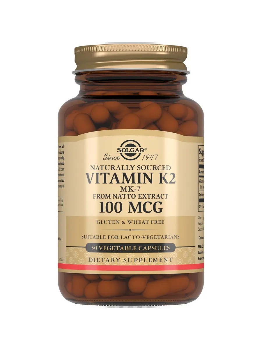 "Натуральный витамин К2 (менахинон 7) 100 мкг" от Солгар - это активная форма витамина К2 в виде менахинона с высоким уровнем биодоступности в оптимальной дозировке 100 мкг для восполнения суточной потребности организма.Витамин К2 играет важную роль в обмене веществ, в укреплении костей и соединительной ткани, в работе почек, участвует в усвоении кальция и обеспечивает взаимодействие кальция и витамина D.