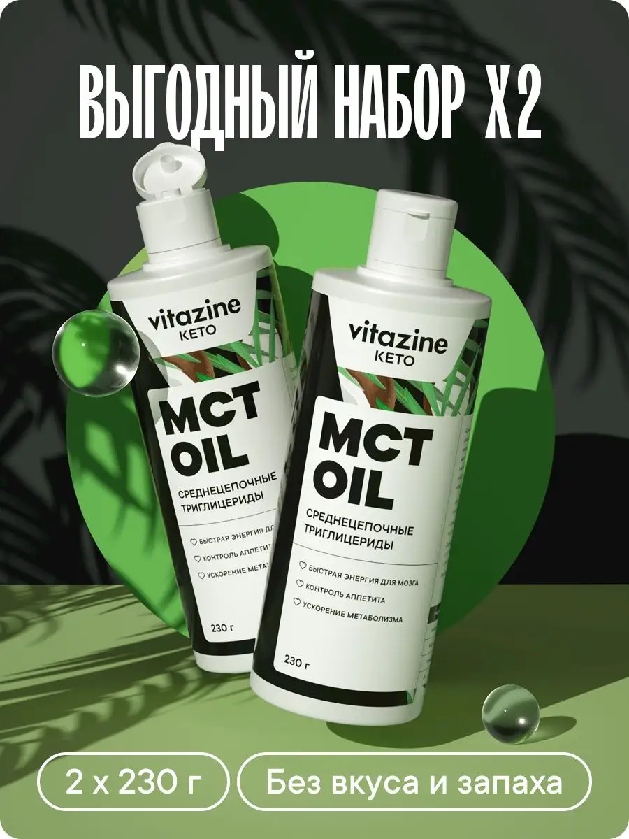 Комплект из 2 бутылок 230 г. Бутылки с крышкой флип-топ. 100% жидкое масло MCT без масел-наполнителей. Кокосовое масло МСТ- источник быстрой энергии для мозга и тела. Быстрое насыщение и контроль голода. Для низкоуглеводной диеты, LCHF, кето диеты, правильного питания, высокожировых диет. Способствует выработке кетоновых тел, запускает процесс жиросжигания, ускоряет метаболизм. MCT масло - это смесь среднецепочечных триглицеридов C8 и С10 - капроновой и каприловой кислоты. Coconut MCT oil получают из натуральных зрелых кокосов. Кокосовое масло пищевое отлично усваивается и считается одним из наиболее полезных источников жиров, особенно если ваш выбор - кето диета или правильное питание. Среднецепочные триглицериды MCT имеют антибактериальный и противогрибковый эффект, снижают уровень холестерина. Укрепляют местный и общий иммунитет, способствуют похудению. У натурального масла нет ярко выраженного вкуса. Оно используется для "пуленепробиваемого" bulletproof кофе, других напитков, салатов, протеиновых коктейлей и т д.