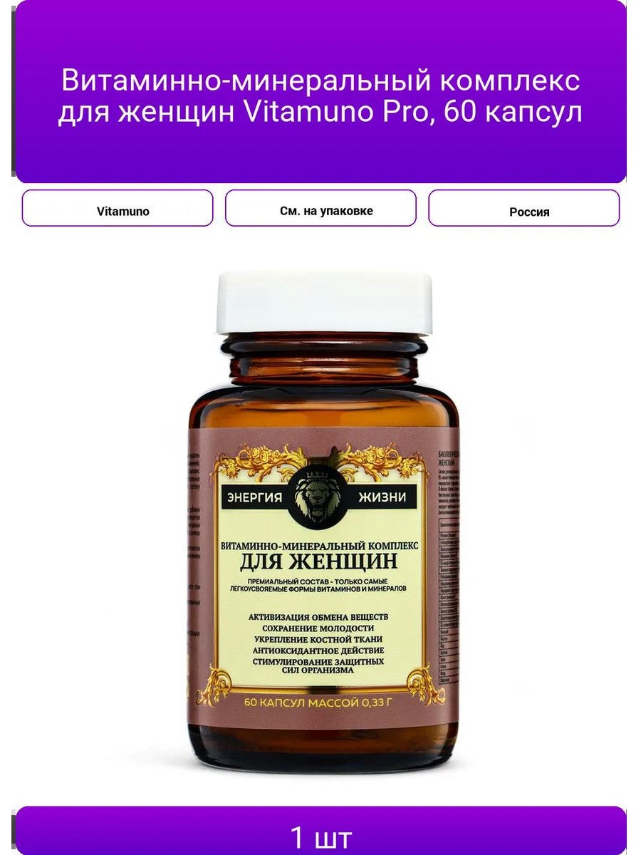 | Комплектация | Витаминно-минеральный комплекс для женщин Vitamuno Pro, 60 капсул |