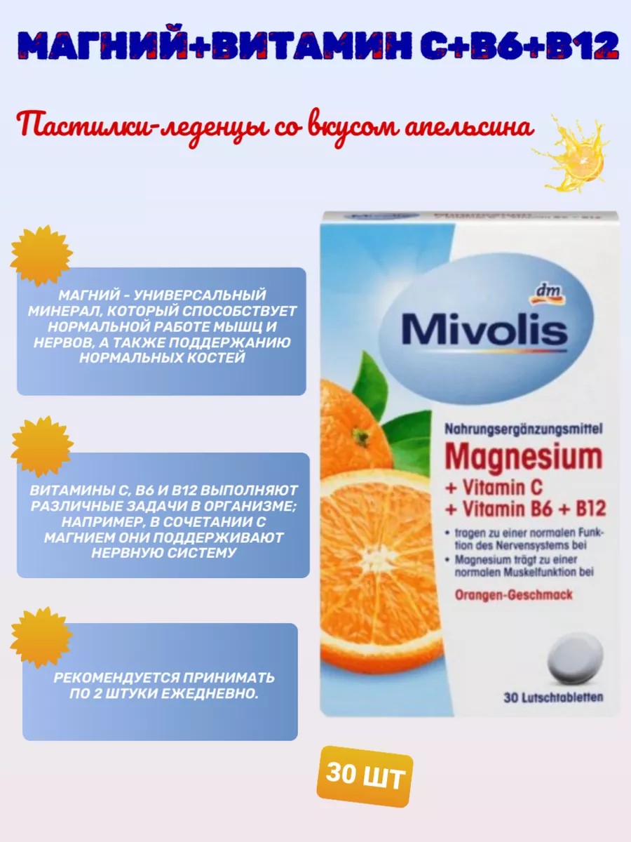 Витамины С, В6 и В12 выполняют различные задачи в организме; например, в сочетании с магнием они поддерживают нервную систему. И как вы уже знаете, все эти питательные вещества содержатся в пастилках-леденцах Mivolis со вкусом апельсина.