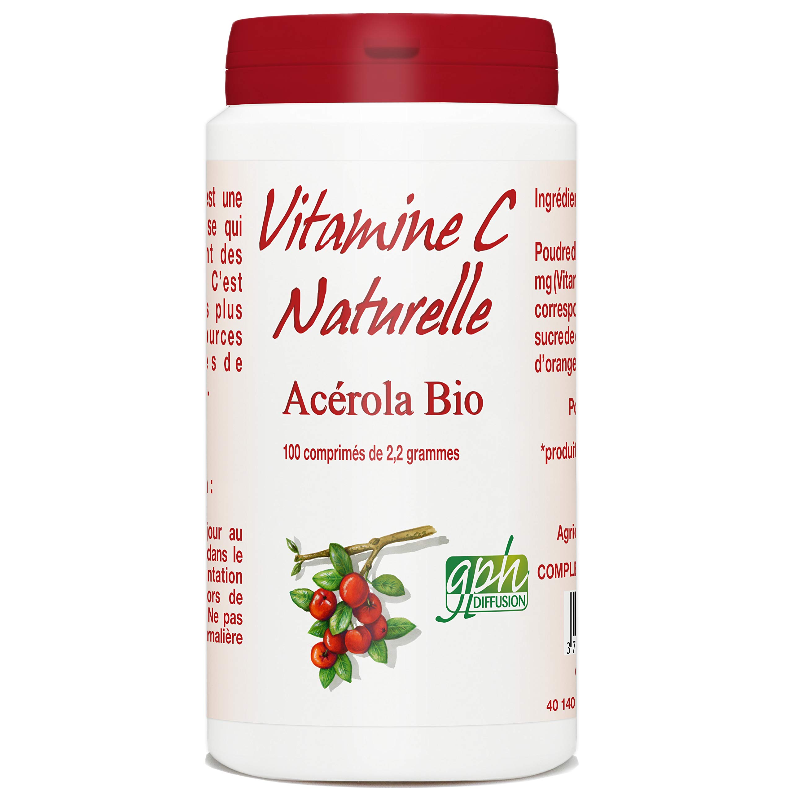 Product type: Vitamin. Brand: GPH DIFFUSION. Organic Acerola Vitamin C 1000 mg 2.2 g 100 tablets.