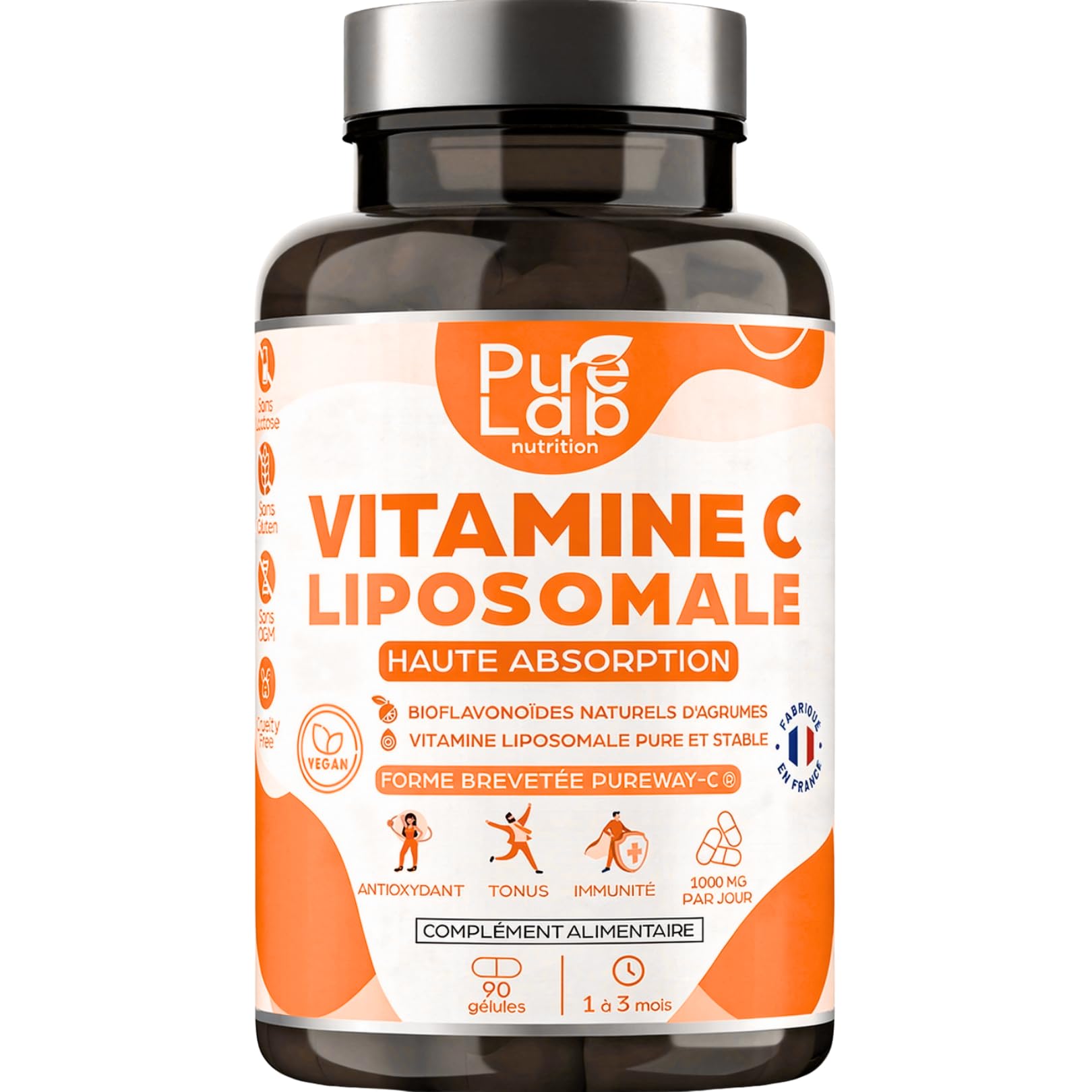 100 FRENCH EXPERTISE: Pure Lab Nutrition controls all processes: R D, manufacturing, and distribution. All stages of R D and manufacturing are carried out in France. 1 to 3 MONTH COURSE (1000mg): To enjoy the many benefits of our "LIPOSOMAL VITAMIN C" supplement, simply take 1 to 3 easy-to-swallow capsules per day. Our bottle contains 90 capsules. Our capsules are 100 vegan. ? BOOST YOUR NATURAL DEFENSES: Vitamin C is an essential nutrient that the body cannot synthesize. It is a true ally that reduces fatigue, stimulates the immune system, boosts energy and vitality, facilitates iron absorption, and promotes collagen formation. PURE AND STABLE LIPOSOMAL VITAMIN C, PATENTED PUREWAY-C: This is the best form of vitamin C on the market. Our regimen provides you with 1000mg day of liposomal vitamin C (via 3 capsules per day), ideal for the whole family! HIGHLY ABSORBED LIPOSOMAL VITAMIN C: The liposomal encapsulation of our Vitamin C (ascorbic acid) is superior to regular Vitamin C, with excellent digestive comfort. It is the most bioavailable bioactive form for optimal absorption and superior effectiveness. The absorption rate of our liposomal vitamin C reaches up to 90 (compared to 10 to 20 for other forms of vitamin C).SAVOIR-FAIRE 100 FRANÇAIS : Pure Lab Nutrition contrôle l'ensemble des process : R D, fabrication et distribution. Toutes les étapes de la R D et de la fabrication sont réalisées en France. 1 à 3 MOIS DE CURE (1000mg) : Pour profiter des nombreux bienfaits de notre complément « VITAMINE C LIPOSOMALE », il vous suffit de prendre 1 à 3 gélules par jour, facile à avaler. Notre flacon est composé de 90 gélules. Nos gélules sont 100 Vegan. ? BOOSTEZ VOS DÉFENSES NATURELLES : La vitamine C est un nutriment essentiel non synthétisé par l'organisme. C'est une véritable alliée qui réduit la fatigue, stimule le système immunitaire, booste le tonus et la vitalité, facilite l'absorption du fer et favorise la formation du collagène. VITAMINE C LIPOSOMALE PURE ET STABLE, BREVETÉE PUREWAY-C : C'est la meilleure forme de vitamine C sur le marché. Notre cure vous apporte un apport de 1000mg jour de vitamine C liposomale (via 3 gélules par jour), idéal pour toute la famille !. VITAMINE C LIPOSOMALE, HAUTE ASSIMILATION : L'encapsulation Liposomale de notre Vitamine C (acide ascorbique) est supérieure aux Vitamine C ordinaires, avec un excellent confort digestif. C'est la forme bioactive la plus biodisponible pour une absorption optimale et une efficacité supérieure. Le taux d'absorption de notre vitamine C liposomale atteint ainsi jusqu'à 90 (contre 10 à 20 pour les autres formes de vitamine C).Vitamine C Liposomale 1000mg - Haute Absorption - Immunité, Antioxydant, Tonus - Formule Brevetée PureWay™ - Sans Lactose, Sans Gluten - Fabriqué en France - 90 gélules, Cure de 1 à 3 mois