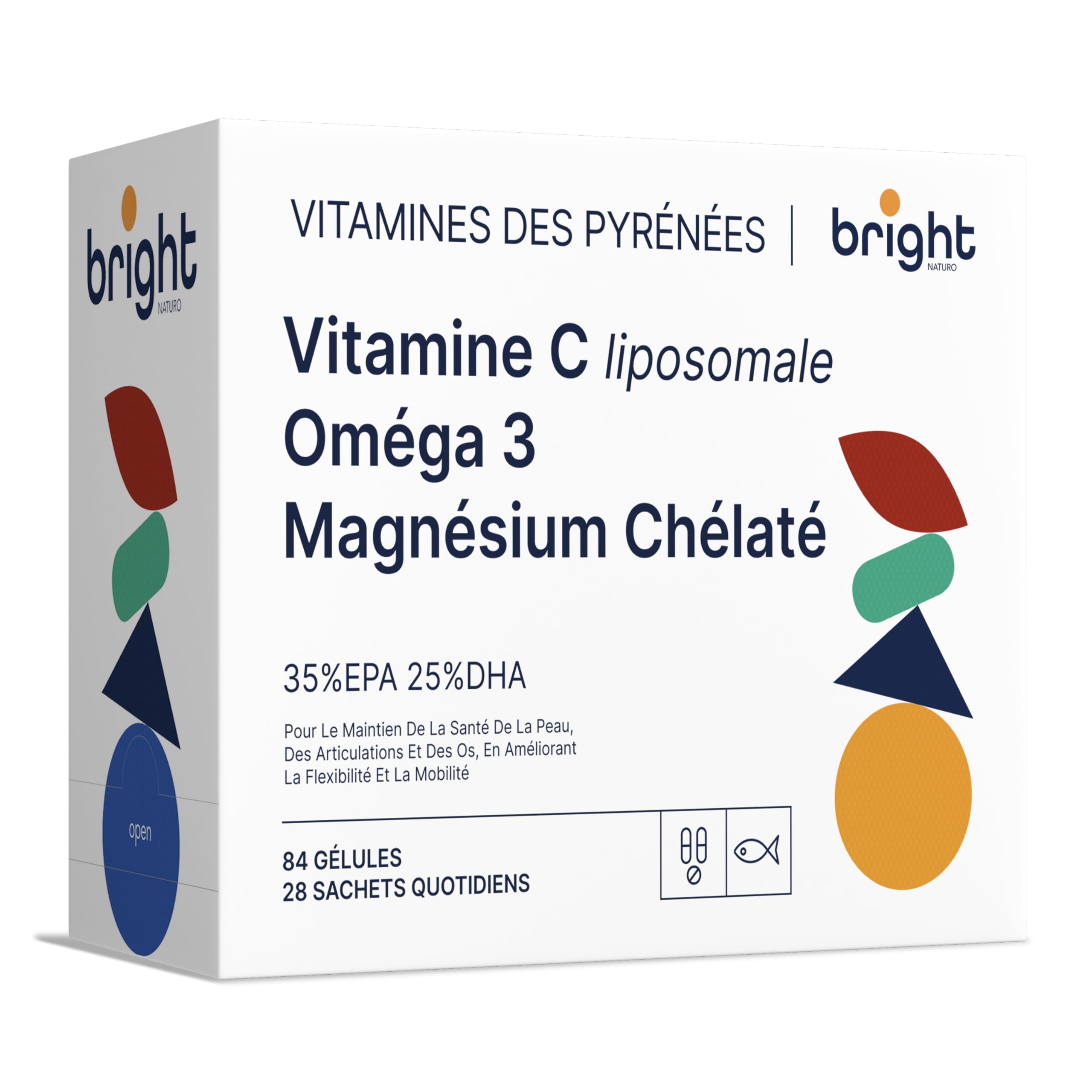 Vitamine C liposomale + om ga-3 + magn sium. Dosage lev . 100 % naturel. Vitamines Bright Naturo. 28 sachets par jour