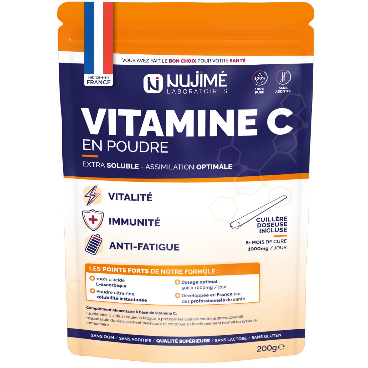 Vitamine C pure en poudre | 1 000mg par dose | Poudre ultra fine solubilit instantan e | 100% acide L-ascorbique | Immunit Vitalit Anti-fatigue | Cuill re doseuse incluse (200G)