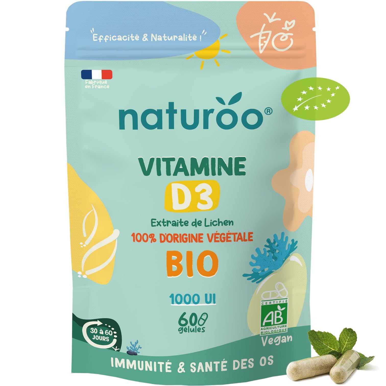 ? Naturo packaging is 100 recyclable and opaque for better protection of vitamins and active ingredients against UV rays and light. Made in France in a laboratory applying HACCP methods, according to the highest quality standards controls carried out by independent laboratories. No additives or excipients are added to the formula. No animal gelatin, gluten-free, or lactose-free. 100 vegan and plant-based formula (active ingredients and capsule). Commitment to Purity: Our vitamin D3 formula is manufactured according to the strictest organic production standards, is vegan, GMO-free, and contains no artificial ingredients: so you can enjoy all the benefits of vitamin D with complete peace of mind. Bone Strengthening: Vitamin D3 is essential for calcium absorption, helping to maintain strong bones and reduce the risk of vitamin D deficiency, especially during months with low sunlight. Immune Muscle Support: Essential for the immune system and muscle function, our vitamin D3 helps strengthen the body's natural defenses and contributes to better muscle health, allowing you to stay active and resilient all year round. Superior Absorption and Bioavailability: Our plant-based formula is encapsulated in easy-to-swallow capsules, optimizing the absorption of vitamin D3 by your body for maximum well-being. The plant-based form (food matrix and cofactors) ensures maximum absorption and increased bioavailability for fast and effective action. Organic Plant-Based Vitamin D3: Our Vitamin D3 is sustainably sourced from lichen, with no animal by-products or additives. Each 2-capsule serving provides 1000 IU, or 500 of the RDA for vitamin D3, supporting bone health and immunity, muscle maintenance, and promoting better calcium absorption. Expiration date: March 2027. Enjoy a pure plant-based source with Naturoo Vitamin D3 extracted from lichen, designed for vegan diets and those seeking a natural and organic alternative.? L'emballage Naturo est 100 recyclable, et opaque pour une meilleure protection des vitamines et des principes actifs face aux UV et à la lumière. FABRICATION FRANCAISE dans un laboratoire appliquant les méthodes HACCP, selon des normes de qualité les plus élevées contrôles réalisés par des laboratoires indépendants. Aucun additif ou excipient n'est ajouté à la formule. Sans gélatine animale, sans gluten, sans lactose. Formule 100 VEGAN et Végetale (actifs et capsule). Engagement pour la Pureté : Notre formule de vitamine D3 est fabriquée selon les normes de production biologique les plus strictes, végane, sans OGM, elle ne contient aucun ingrédient artificiel : pour que vous puissiez profiter de tous les bénéfices de la vitamine D en toute tranquillité. Renforcement des Os : La vitamine D3 est essentielle pour l'absorption du calcium, aidant à maintenir des os solides et à réduire le risque de carence en vitamine D, surtout pendant les mois de faible ensoleillement. Soutien Immunitaire et Musculaire : Essentielle pour le système immunitaire et la fonction musculaire, notre vitamine D3 aide à renforcer les défenses naturelles de l'organisme et contribue à une meilleure santé musculaire, vous permettant de rester actif et résilient tout au long de l'année. Absorption et Biodisponibilité Supérieures : Notre formule végétale est encapsulée dans des gélules faciles à avaler, optimisant l'absorption de la vitamine D3 par votre corps pour un bien-être maximal. La forme végétale (matrice alimentaire et cofacteurs) assure une absorption maximale et une biodisponibilité accrue, pour une action rapide et efficace. Vitamine D3 Bio d'Origine Végétale : Notre Vitamine D3 est obtenue de façon durable à partir de lichen, sans aucun sous-produit animal ni additif. Chaque dose de 2 gélules apporte 1000 UI soit 500 des AJR en vitamine D3, soutenant la santé osseuse et l'immunité, le maintien musculaire et favorisant une meilleure absorption du calcium. Date d'expiration : mars 2027. Profitez d'une source végétale pure avec la vitamine D3 Naturoo extraite de lichen, conçue pour les régimes végans et ceux qui recherchent une alternative naturelle et bio.Vitamine D Bio Naturelle et Végétale, Vitamine D3 biologique à base de Lichen 1000 UI (500 des AJR) 60 gélules (1 à 2 mois) Premium Vegan Pour Hommes et Femmes Extraits de Lichen bio