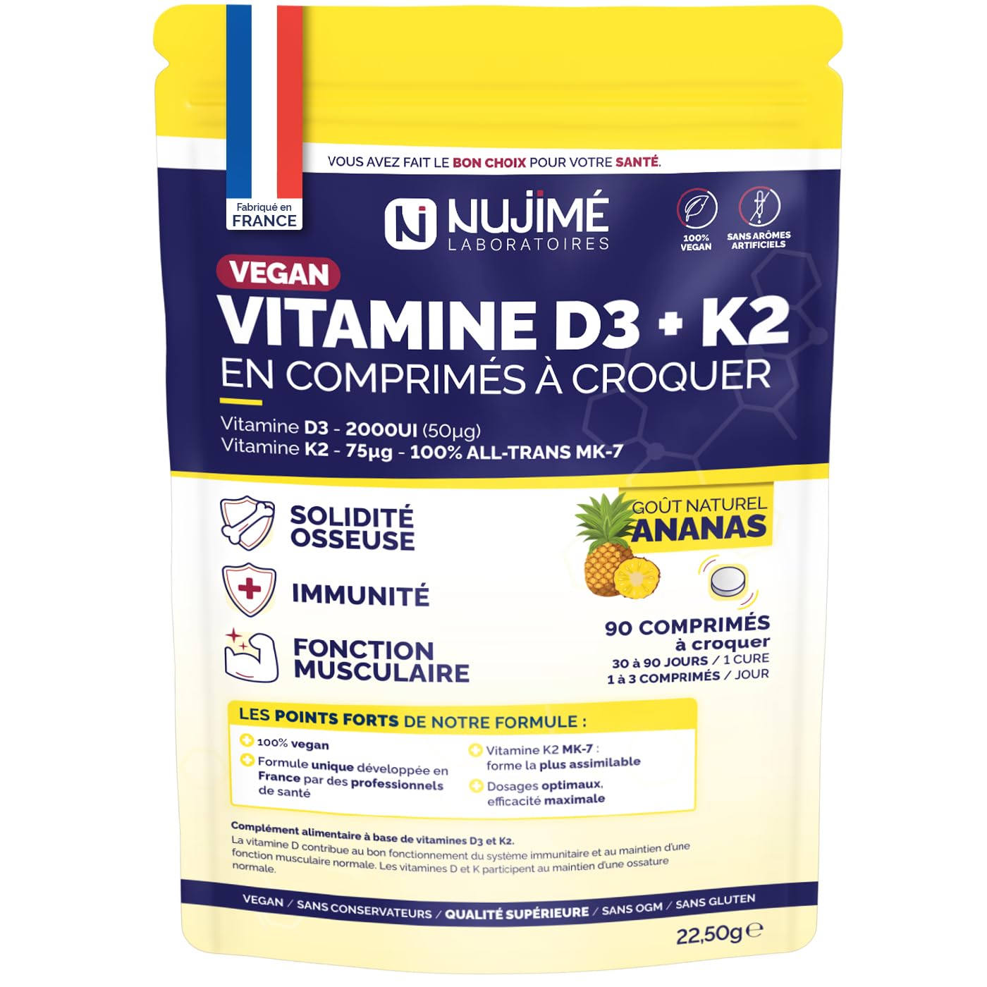Vitamine D3 (2000UI) + K2 (all-trans MK7 75 g) | 100% VEGAN | Solidit Osseuse Muscles Immunit | Ar me naturel d ananas | Fabriqu en France (90 comprim s | 3 mois)