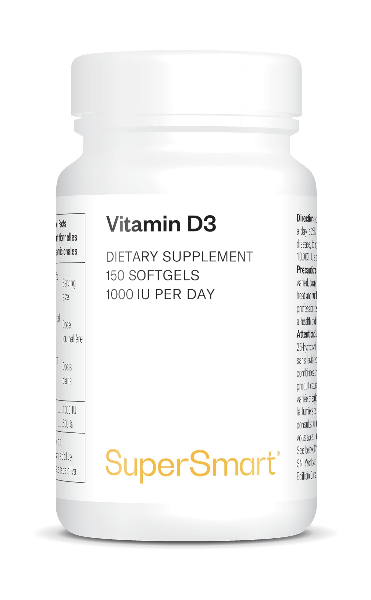 SATISFACTION GUARANTEED: We strive to offer you a range of highly effective products, along with exceptional customer service. If you have any questions or concerns, please feel free to contact us at any time. We are here to help you become the best version of yourself. DIRECTIONS FOR USE: Take 1 capsule daily, as directed by your doctor. This product is a nutritional supplement and should not be used as a substitute for a balanced and varied diet or a healthy lifestyle. Keep out of reach of children, away from light, heat, and moisture. NATURAL INGREDIENTS: Vitamin D3, of animal origin, is found primarily in oily fish, egg yolks, liver, and liver oils. At Supersmart, we choose raw materials rich in active ingredients. We also prioritize eco-responsible practices and natural excipients. YOUR BONES AND IMMUNE SYSTEM'S BEST FRIEND: With its benefits for bone, muscle, immune, and cognitive health, there's no reason to deprive yourself of this little wonder of nature. A vitamin D deficiency can have serious consequences for your body. ? SUPERSMART: With 31 years of expertise, we are one of the leading brands in Europe to market food supplements. Our formulas are developed by a Doctor of Microbiology and Immunology. With hundreds of thousands of satisfied customers, Supersmart is a key player in nutritional supplementation.SATISFACTION GARANTIE : Nous mettons tout en œuvre pour vous proposer une gamme de produits hautement efficaces, tout en vous offrant un service client exceptionnel. Si vous avez des questions ou des préoccupations, n'hésitez pas à nous contacter à tout moment. Nous sommes là pour vous aider à devenir la meilleure version de vous-même. CONSEIL D'UTILISATION : Prendre 1 gélule par jour et selon les conseils de votre médecin. Ce produit est un supplément nutritionnel et ne doit pas être utilisé en remplacement d'une alimentation équilibrée et variée, ni d'un mode de vie sain. Conservez hors de portée des enfants, à l'abri de la lumière, de la chaleur et de l'humidité. DES INGRÉDIENTS NATURELS : D'origine animale, la vitamine D3 se trouve principalement dans les poissons gras, les jaunes d'œufs, le foie et les huiles de foie. Chez Supersmart, nous choisissons des matières premières riches en ingrédients actifs. Nous privilégions aussi les démarches éco-responsables et les excipients naturels. LE MEILLEUR AMI DE VOS OS ET DE VOTRE SYSTÈME IMMUNITAIRE : Avec ses bienfaits pour la santé des os, des muscles, du système immunitaire et des fonctions cognitives, il n'y a aucune raison de se priver de cette petite merveille de la nature. Une carence en vitamine D peut avoir des conséquences fâcheuses pour votre organisme. ? SUPERSMART : 31 ans d'expertise, nous sommes l'une des premières marques en Europe à commercialiser des compléments alimentaires. Nos formules sont mises au point par un Docteur en microbiologie et en immunologie. Avec des centaines de milliers de clients satisfaits, Supersmart figure comme un acteur incontournable de la supplémentation nutritionnelle.Vitamine D3 - Boost Immunitaire - Aide à Maintenir une Bonne Santé des Os, des Muscles et des Dents - Haute Absorption - Sans OGM - 150 Softgels - Supersmart