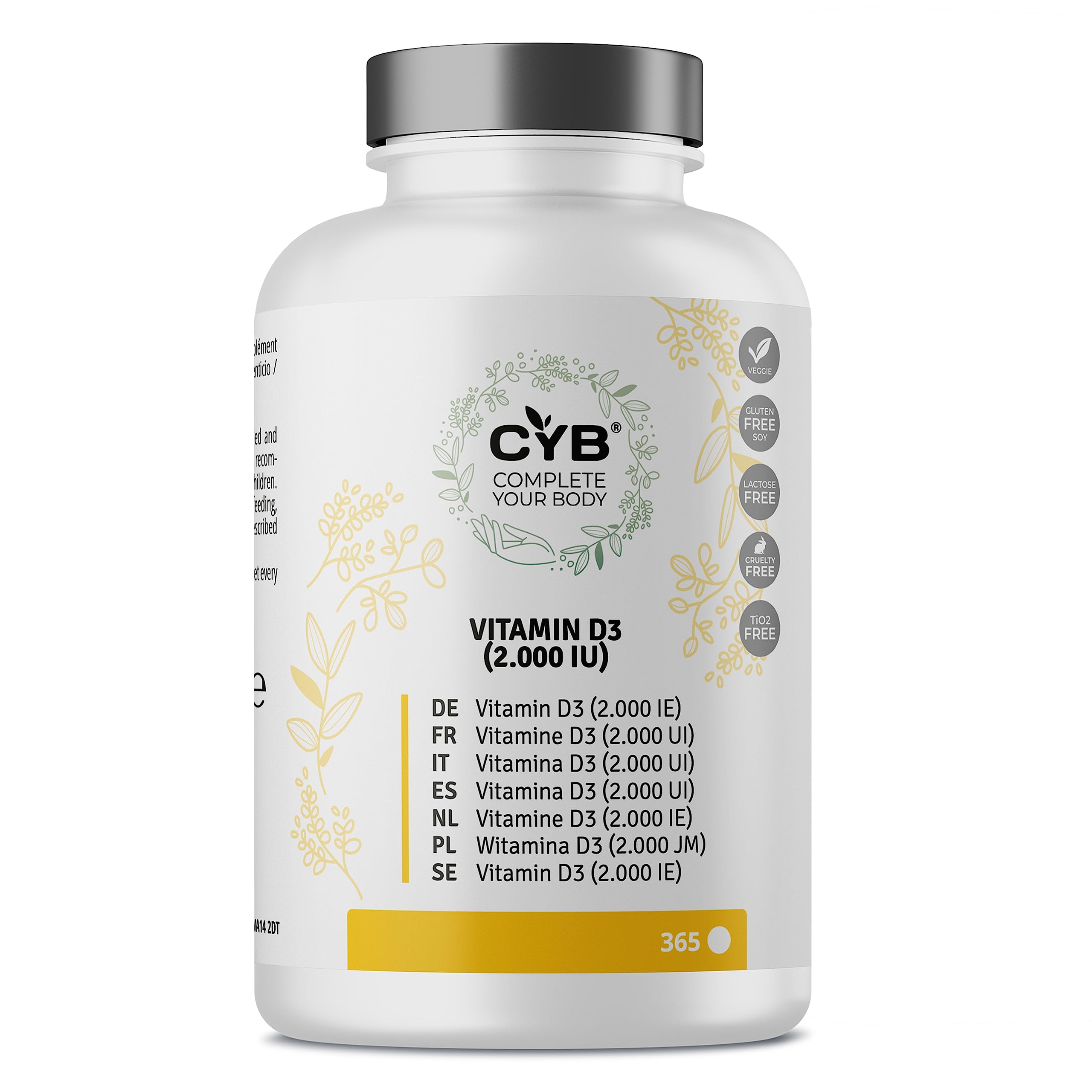 CYB - Complete Your Body Long-standing reputation for prestige and high standards. Through years of experience in the healthcare industry, we have gained in-depth knowledge of what it takes to create products that truly make a difference in people's lives. As qualified and licensed manufacturers, we deliver directly from production to the user. QUALITY We take great pride in the care and attention we put into creating our multivitamin products. Every step of the process is carried out with the utmost concern for quality and safety. From sourcing the finest ingredients to manufacturing the tablets, we ensure that every aspect of our product meets the strictest standards. PRODUCT Due to the lack of sunlight in winter, the skin tends to produce less vitamin D3. These convenient and easy-to-swallow tablets can help compensate for vitamin D deficiency. Vitamin D3 supports the immune system and protects cells from oxidative stress. Moreover, it contributes to normal calcium levels in the body and facilitates the absorption and use of calcium and phosphorus. 1 YEAR SUPPLY That's right, with just one pack, you'll have a full year's supply of this essential supplement to support your overall health and well-being with this daily supplement. VITAMIN D3 Each tablet contains 50 mcg of vitamin D3, essential for sunlight, in a convenient and easy-to-swallow daily tablet. Vegetarian, gluten-free, lactose-free, non-GMO, color-free, and allergen-free supplement.CYB - Complet Votre Corps Réputation de longue date pour son prestige et ses normes élevées. Grâce à nos années d'expérience dans le secteur de la santé, nous avons acquis une connaissance approfondie de ce qu'il faut faire pour créer des produits qui font vraiment la différence dans la vie des gens. En tant que fabricants qualifiés et agréés, nous livrons directement de la production à l'utilisateur. QUALITÉ Nous sommes très fiers du soin et de l'attention que nous apportons à la création de nos produits multivitaminés. Chaque étape du processus est exécutée avec le plus grand souci de qualité et de sécurité. De l'achat des meilleurs ingrédients à la fabrication des comprimés, nous veillons à ce que chaque aspect de notre produit réponde aux normes les plus strictes. PRODUIT En raison du manque de soleil en hiver, la peau a tendance à produire moins de vitamine D3. Ces comprimés pratiques et faciles à avaler peuvent aider à compenser la carence en vitamine D. La vitamine D3 soutient le système immunitaire, protège les cellules du stress oxydatif. D'ailleurs, elle contribue à un niveau normal de calcium dans l'organisme et facilite l'absorption et l'utilisation du calcium et du phosphore. 1 ANNÉE DE FOURNITURE C'est vrai, avec un seul paquet, vous aurez une année complète de ce supplément essentiel pour soutenir votre santé et votre bien-être en général avec ce supplément quotidien. VITAMINE D3 Chaque comprimé contient 50 µg de la vitamine D3, essentielle à l'ensoleillement, dans un comprimé quotidien pratique et facile à avaler. Supplément végétarien, sans gluten, sans lactose, sans OGM, sans colorant ni allergène.Vitamine D3 CYB 2000 UI - 50 µg de vitamine D3 pure à forte dose - 365 comprimés végétariens