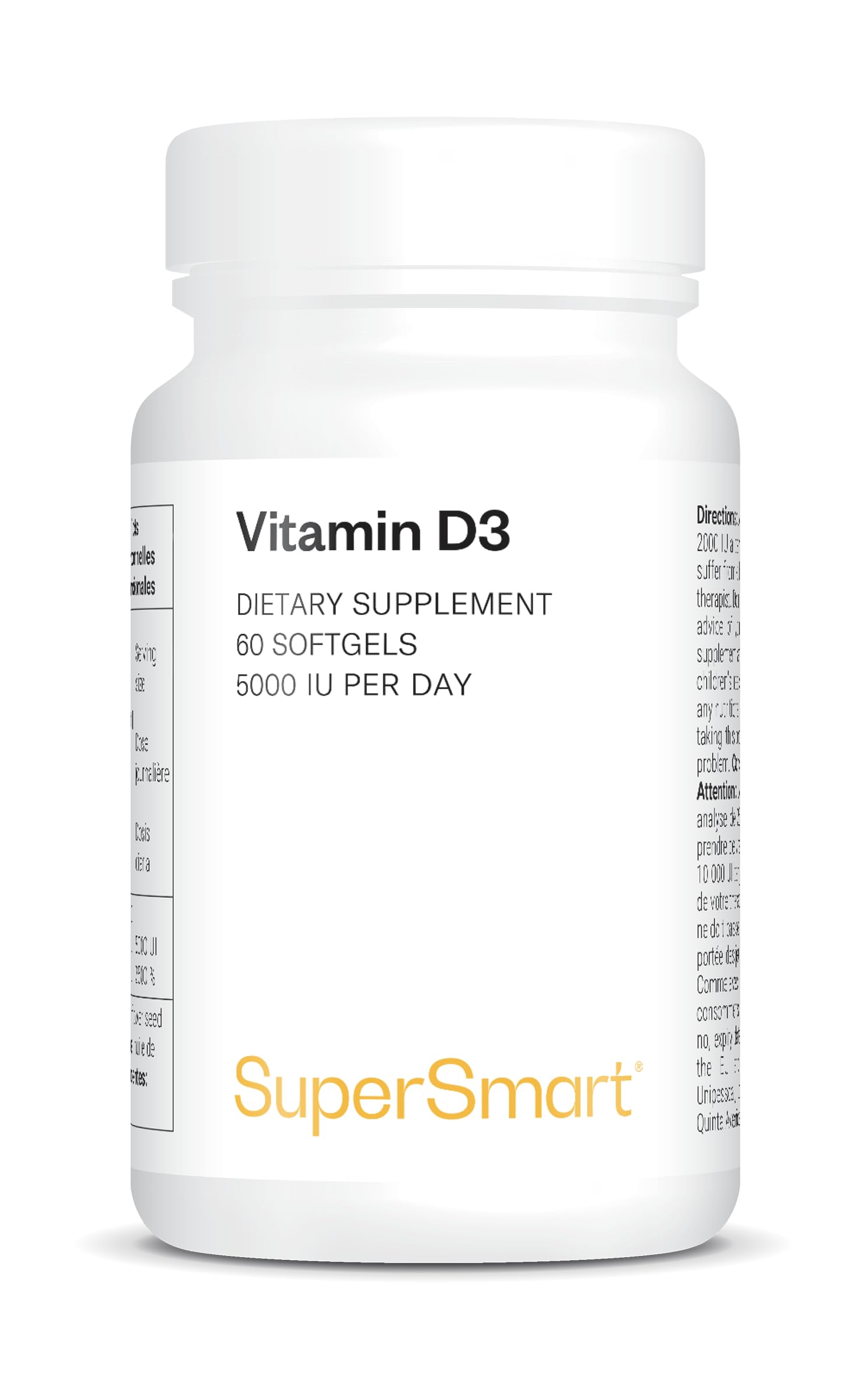 SATISFACTION GUARANTEED: We strive to offer you a range of highly effective products while providing exceptional customer service. If you have any questions or concerns, please feel free to contact us at any time. We are here to help you become the best version of yourself. DIRECTIONS FOR USE: Take 1 capsule daily or as directed by your healthcare professional. This product is a nutritional supplement and should not be used as a substitute for a balanced and varied diet or a healthy lifestyle. Keep out of reach of children, away from light, heat, and moisture. NATURAL INGREDIENTS: Vitamin D3 is naturally produced by the skin when exposed to sunlight. This is why a course of treatment is important for people who have difficulty getting regular sun exposure. It is packaged in vegetable oil capsules to maximize absorption. At Supersmart, we choose raw materials rich in active ingredients. ? SHINE YOUR HEALTH BRIGHTLY: With its high dosage of 5000 IU of vitamin D3, this supplement strengthens your immune system, supports bone and muscle health, and boosts your natural energy. Don't let a lack of sunshine deprive you of its essential benefits. Fill your vitamin D gaps and shine all year round! ? SUPERSMART: With over 30 years of expertise, we are one of the leading brands in Europe to market food supplements. Our formulas are developed by an in-house team of specialists. With hundreds of thousands of satisfied customers, SUPERSMART is a key player in nutritional supplementation.SATISFACTION GARANTIE : Nous mettons tout en œuvre pour vous proposer une gamme de produits hautement efficaces, tout en vous offrant un service client exceptionnel. Si vous avez des questions ou des préoccupations, n'hésitez pas à nous contacter à tout moment. Nous sommes là pour vous aider à devenir la meilleure version de vous-même. CONSEIL D'UTILISATION : Prendre 1 gélule par jour ou selon les conseils de votre thérapeute. Ce produit est un supplément nutritionnel et ne doit pas être utilisé en remplacement d'une alimentation équilibrée et variée, ni d'un mode de vie sain. Conservez hors de portée des enfants, à l'abri de la lumière, de la chaleur et de l'humidité. DES INGRÉDIENTS NATURELS : La Vitamine D3 est produite naturellement par la peau lorsqu'elle est exposée aux rayons du soleil. D'où l'importance d'une cure pour les personnes qui ont des difficultés à s'exposer régulièrement au soleil. Elle est conditionnée sous forme de gélules huileuses végétales pour maximiser son absorption. Chez Supersmart, nous choisissons des matières premières riches en ingrédients actifs. ? FAITES BRILLER VOTRE SANTÉ DE MILLE FEUX : Avec son dosage élevé de 5000 UI de vitamine D3, ce supplément renforce votre système immunitaire, soutient la santé osseuse et musculaire, et booste votre énergie naturelle. Ne laissez pas le manque de soleil vous priver de ses bienfaits essentiels. Comblez vos carences en vitamine D et brillez tout au long de l'année !. ? SUPERSMART : 30 ans d'expertise, nous sommes l'une des premières marques en Europe à commercialiser des compléments alimentaires. Nos formules sont mises au point par une équipe de spécialistes en interne. Avec des centaines de milliers de clients satisfaits, SUPERSMART figure comme un acteur incontournable de la supplémentation nutritionnelle.Vitamine D3 - Dosage Puissant Forme Biodisponible - Soutient le Système Immunitaire, les Os et le Coeur - Permet une Meilleure Assimilation du Calcium - Sans Gluten - Supersmart