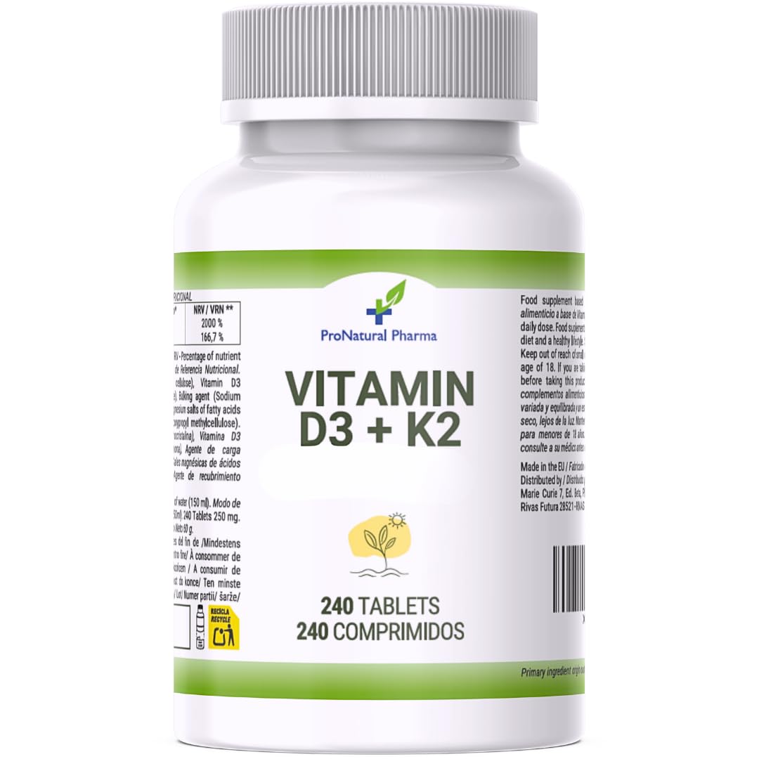 : ACTIVATE YOUR HEALTH WITH OUR HIGH-DOSE VITAMIN D3 AND K2! Discover the dietary supplement that will transform your well-being. Our advanced formula combines 4000 IU of Vitamin D3 and 125 µg of Vitamin K2, offering high bioavailability so your body can fully benefit from its properties. Quality Guaranteed: Made in the EU to strict quality standards, our product is a safe and reliable option to supplement your daily diet. ProNatural Pharma is a young and dynamic Spanish company, made up of a team of experts committed to offering you the best quality at the best price. Your satisfaction is our priority. If you are not satisfied with your purchase, contact us and we will send you an immediate replacement. Don't wait any longer! Visit our website and discover all our products and promotions. Ingredients: Bulking agent (microcrystalline cellulose), vitamin D3 (cholecalciferol), vitamin K2 (menaquinone MK-7), bulking agent (sodium carboxymethyl starch), and anti-caking agents (magnesium salts of fatty acids and silicon dioxide). Tablet: Coating agent (hydroxypropyl methylcellulose). P.when('A').execute(function(A) { A.on('a:expander:toggle_description:toggle:collapse', function(data) { window.scroll(0, data.expander. expander[0].offsetTop-100) }) }) Directions: Dosage: 1 tablet every 2 days with plenty of water (150 ml). Safety Warning: Food supplements are not a substitute for a balanced and varied diet and a healthy lifestyle. store closed in a cool, dry place, away from light. Keep out of reach of young children. Do not exceed the recommended daily dose. This product is not suitable for those under 18 years of age. If you are taking anticoagulant medication, consult your doctor before taking this product. See moreWhy Choose Us? High Bioavailability: Our micro-tablets are designed for rapid absorption. Complete Formula: A synergistic combination that maximizes the benefits for your health. 240 Micro-Tablets: An 8-month supply of continuous well-being. 5. Ideal Supplement for Nutritional Deficiencies: Many people don't get enough Vitamin D from sunlight or their diet, especially between October and April. Our supplement is the ideal solution to address this deficiency and ensure your body receives what it needs. 4. Improves Your Mood. 3. Cardiovascular Health: This powerful combination benefits not only your bones but also your heart. Vitamin K2 prevents arterial calcification, promoting optimal circulation and a healthy cardiovascular system. Boosts Your Immune System: Known for its ability to strengthen the body's defenses, Vitamin D3 helps you stay healthy, especially during the colder months or periods of high risk for illness. 1. Superior Bone Health: Vitamin D3 is essential for calcium absorption, which is vital for maintaining strong, healthy bones. Vitamin K2 regulates calcium in the body, ensuring it is deposited in bones and not in arteries. ACTIVATE YOUR HEALTH WITH OUR HIGH-DOSE VITAMIN D3 AND K2! Discover the dietary supplement that will transform your well-being. Our advanced formula combines 4000 IU of Vitamin D3 and 125 µg of Vitamin K2, offering high bioavailability so your body can fully benefit from its properties.Description du produit ACTIVEZ VOTRE SANTÉ AVEC NOTRE VITAMINE D3 ET K2 À HAUTE DOSE ! Découvrez le complément alimentaire qui transformera votre bien-être. Notre formule avancée combine 4000 UI de Vitamine D3 et 125 µg de Vitamine K2, offrant une haute biodisponibilité pour que votre corps profite au maximum de ses bienfaits. Qualité Garantie : Fabriqué dans l'UE selon des normes de qualité strictes, notre produit est une option sûre et fiable pour compléter votre alimentation quotidienne. ProNatural Pharma est une entreprise espagnole jeune et dynamique, composée d'une équipe d'experts engagés à vous offrir la meilleure qualité au meilleur prix. Votre satisfaction est notre priorité. Si vous n'êtes pas satisfait de votre achat, contactez-nous et nous vous enverrons un remplacement immédiat. N'attendez plus ! Visitez notre site web et découvrez tous nos produits et promotions. Ingrédients Agent de charge (cellulose microcristalline), vitamine D3 (cholécalciférol), vitamine K2 (Ménaquinone MK-7), agent de charge (carboxyméthylamidon sodique) et agents antiagglomérants (sels de magnésium d'acides gras et dioxyde de silicium). Comprimé : Agent d'enrobage (Hydroxypropylméthylcellulose) P.when('A').execute(function(A) { A.on('a:expander:toggle_description:toggle:collapse', function(data) { window.scroll(0, data.expander. expander[0].offsetTop-100) }) }) Mode d'emploi Dose: 1 Comprimé tous les 2 jours avec beaucoup d'eau (150 ml) Avertissement De Sûreté Les compléments alimentaires ne remplacent pas une alimentation équilibrée et variée et une mode de vie sain. Conserver fermé, dans un endroit frais et sec, à l'abri de la lumière. Conserver hors de porté des jeunes enfants. Ne pas depasser la dose quotidienne recommandée. Ce produit ne convient pas aux moins de 18 ans. Si vous prenez des médicaments anticoagulants, consultez votre médecin avant de prendre le produit. Voir plusPourquoi nous choisir ? Haute Biodisponibilité : Nos micro-comprimés sont conçus pour une absorption rapide. Formule Complète : Une combinaison synergique qui maximise les bienfaits pour votre santé. 240 Micro-Comprimés : Approvisionnement pour 8 mois de bien-être continu. 5. Complément Idéal pour les Carences Nutritionnelles : Beaucoup de personnes ne reçoivent pas assez de Vitamine D par le soleil ou leur alimentation, surtout entre octobre et avril. Notre supplément est la solution idéale pour pallier cette carence et assurer que votre corps reçoive ce dont il a besoin. 4. Améliore votre Humeur. 3. Santé Cardiovasculaire : Cette puissante combinaison ne bénéficie pas seulement à vos os, mais aussi à votre cœur. La Vitamine K2 prévient la calcification artérielle, favorisant une circulation optimale et un système cardiovascu