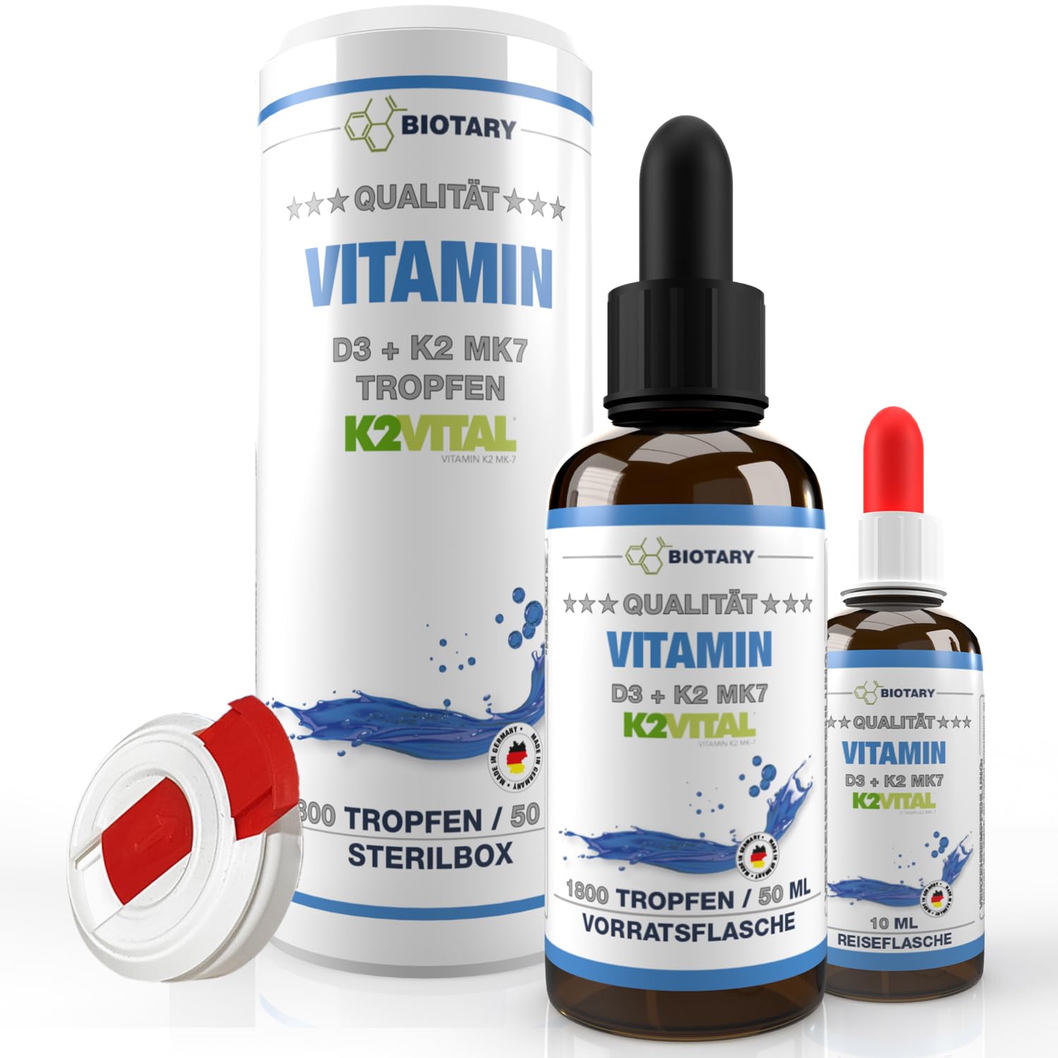 LAB TESTED: During production, we don't rely solely on raw material certifications. Once finished, we also have our products tested by an independent German institute. This means you benefit from a consistently high level of purity, safety, and quality. PRICE-PERFORMANCE RATIO: High-dose drops of D3 - cholecalciferol and K2 - menaquinone with 25 µg (1000 IU) of vitamin D3 and 25 µg of vitamin K2 at 99.7 All-Trans MK-7 per drop. Long-lasting supply in liquid form with 1800 drops (50 ml) and a depot effect. VEGAN ADDITIVE-FREE: This BIOTAIRE product is 100 plant-based. It is completely free of allergens, flavors, colors, gluten, lactose, soy lecithin, aspartame, and GMOs. This product is therefore also ideal for vegans. SUPERIOR QUALITY FROM GERMANY: Because oil-based products attract dust, you will receive our vitamins in a STERILE, resealable BOX. This prevents unwanted light and dust and keeps the product fresh for longer. The 10 ml TRAVEL BOTTLE is refillable and ideal for on-the-go use. Product – Made in Germany according to ISO 9001, HACCP, and GMP certifications. HIGH BIOAVAILABILITY: Vitamins D3 and K2 are fat-soluble substances. We use the highest quality MCT-C8 oil form (caprylic acid) to support the vitamins. This is ideal for stabilizing vitamin K2 and is also a healthy source of energy. Vegetarian and free from unwanted additives.TESTÉ EN LABORATOIRE : Lors de la production, nous ne nous appuyons pas uniquement sur les certifications des matières premières. Une fois terminés, nous faisons également tester nos produits par un institut allemand indépendant. Cela signifie que vous bénéficiez d'un niveau élevé et constant de pureté, de sécurité et de qualité. RAPPORT PRIX - PERFORMANCE : Gouttes à haute dose de D3 - cholécalciférol et K2 - ménaquinone avec 25 µg (1000 UI) de vitamine D3 et 25 µg de vitamine K2 à 99,7 All-Trans MK-7 par goutte. Approvisionnement longue durée sous forme liquide avec 1800 gouttes (50 ml) et effet dépôt. VEGAN SANS ADDITIFS : - Ce produit BIOTAIRE est 100 végétal. Il est absolument sans allergènes, sans arômes, ni colorants, sans gluten, sans lactose, sans lécithine de soja, sans aspartame, sans OGM. Ce produit est donc également idéal pour les végétaliens. QUALITÉ SUPÉRIEURE D'ALLEMAGNE : Les produits contenant de l'huile attirant la poussière, vous recevrez nos vitamines dans une BOÎTE STÉRILE refermable. Cela évite la lumière et la poussière indésirables et maintient le produit frais plus longtemps. La BOUTEILLE DE VOYAGE de 10 ml est rechargeable et idéale pour les déplacements. Produit – Fabriqué en Allemagne selon les certifications ISO 9001, HACCP et GMP. HAUTE BIODISPONIBILITÉ : Les vitamines D3 et K2 sont des substances liposolubles. Nous utilisons la forme d'huile MCT-C8 de la plus haute qualité (acide caprylique) pour soutenir les vitamines. C'est idéal pour stabiliser la vitamine K2 et constitue également une source d'énergie saine. Végétarien et sans additifs indésirables.Vitamine D3 K2 Gouttes 50 ml - 99,7 All-Trans boîte stérile incluse flacon de voyage - haute dose 1 000 UI 25 µg D3 20 µg K2, testé en laboratoire