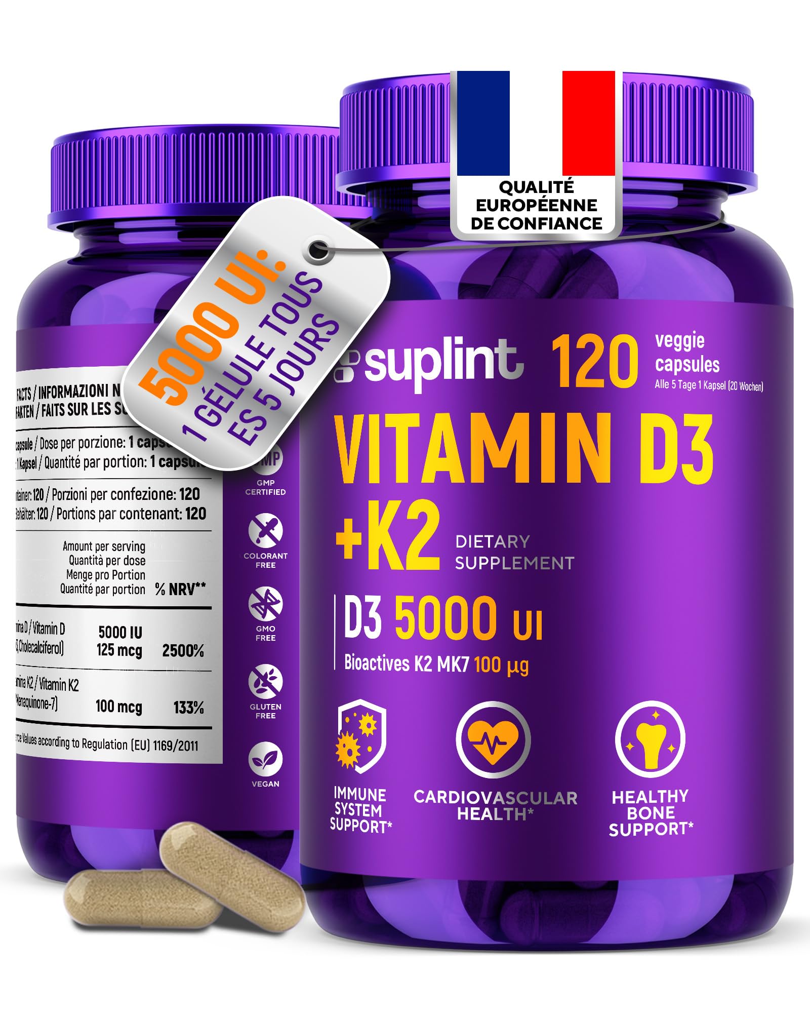 120 capsules 20 months – 1 capsule every 5 days – an ultra-long supply for your health routine, without effort or frequent reordering. Capsules, better than tablets – Vegan capsules are easy to swallow, well-tolerated, and quickly absorbed – sugar-free, filler-free, 100 pure formula. Immune system and well-being – Vitamin D supports the normal function of the immune system and daily well-being – ideal during darker seasons or periods of low sunlight. Supports bones and teeth – 5,000 IU of vitamin D3 100 µg of K2 MK-7 promote calcium absorption, bone density, and dental health – a balanced formula for lasting stability and strength. Dutch quality and lab-verified – Formulated in the Netherlands, GMP certified, and tested by Eurofins (04.02.2025) for purity and safety. One easy-to-swallow vegan capsule every 5 days.120 gélules 20 mois – 1 gélule tous les 5 jours – approvisionnement ultra-long pour votre routine santé, sans effort ni commandes fréquentes. Les gélules, mieux que les comprimés – Les gélules véganes sont faciles à avaler, bien tolérées et rapidement absorbées – sans sucre, sans agents de charge, formule 100 pure. Système immunitaire et bien-être – La vitamine D soutient le fonctionnement normal du système immunitaire et le bien-être quotidien – idéale en saison sombre ou faible ensoleillement. Soutient les os et les dents – 5 000 UI de vitamine D3 100 µg de K2 MK-7 favorisent l'absorption du calcium, la densité osseuse et la santé dentaire – formule équilibrée pour stabilité et force durables. Qualité néerlandaise et vérifiée en laboratoire – Formulé aux Pays-Bas, certifié GMP et testé par Eurofins (04.02.2025) pour pureté et sécurité. Une capsule végane facile à avaler tous les 5 jours.Vitamine D3 K2 Haute Dose – 5000 UI Vitamine D 100 µg K2 MK-7 – 120 Gélules Véganes – Développé aux Pays-Bas – Certifié GMP Testé en Laboratoire – Soutien Os, Dents Immunité