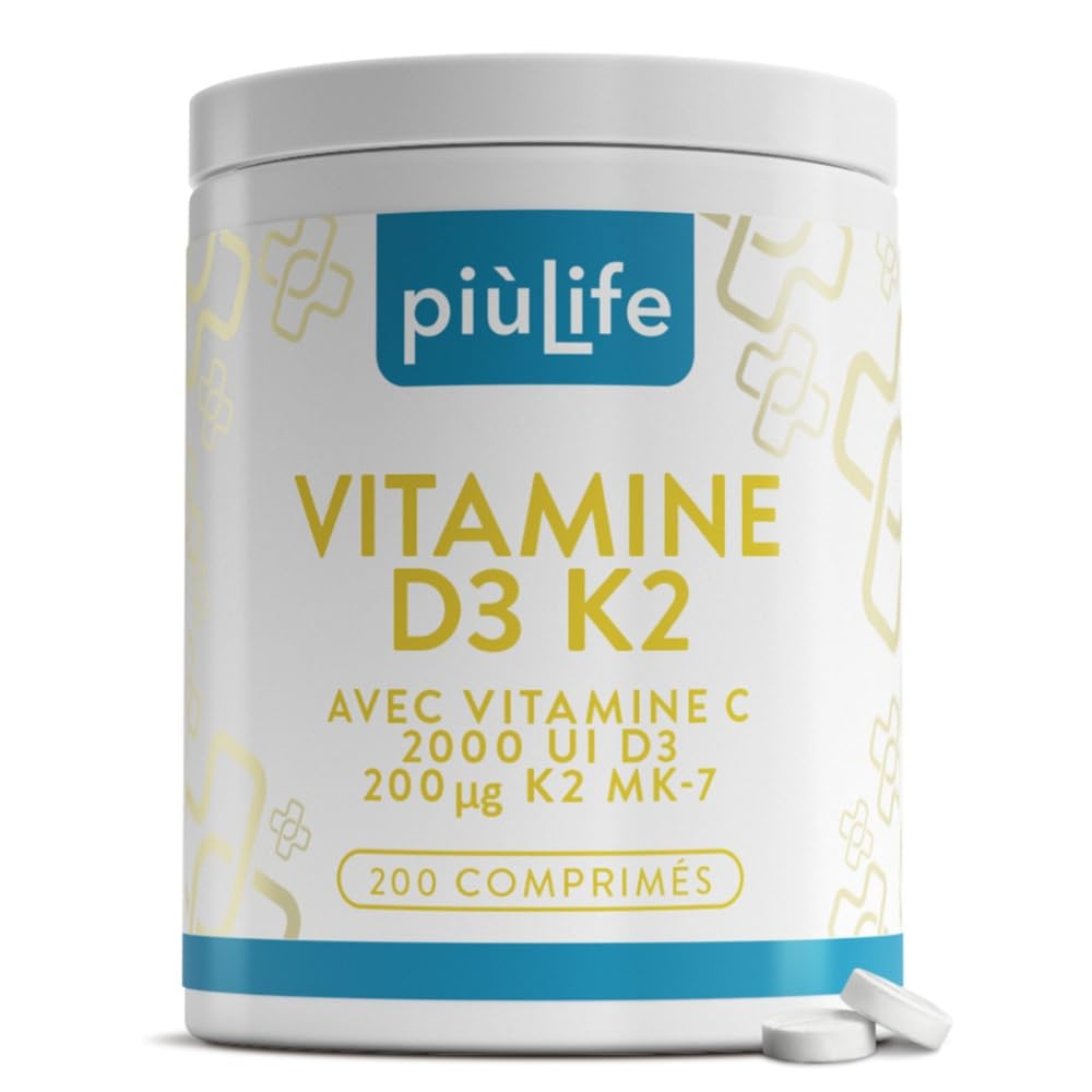 For a synergistic effect, combine PiùLife Vitamin D3 K2 with PiùLife Complete Magnesium, which contributes to muscle and bone health. How and when - Vitamin D3 K2 MK7 is recommended for colder periods, seasonal changes, and when you need energy to support your physical activity. The suggested dose is 1 tablet per day. Bone Health - The PiùLife supplement stands out for its beneficial properties for bones, thanks to the combination of vitamins D3 and K2: while the former regulates the body's calcium and phosphorus levels, the latter ensures the proper absorption of these minerals by the bones and the entire body. The addition of vitamins C and D also supports your immune system, helping you regain your daily well-being. PiùLife Vitamin K2 MK7 Quality - d3 k2 vitamin was created from a careful selection of raw materials, leading to the development of a certified MK-7 vitamin K2, or menaquinone-7, supplement to ensure quality products for your body's well-being. [MK7 High Concentration Premium Menaquinone 100 All-Trans]. Vitamin D3, Vitamin K2, and Vitamin C - PiùLife D3 K2 contains 2000 IU (50µg) of vitamin D3, or cholecalciferol, and 200µg of certified MK7 vitamin K2, or menaquinone. The formula for your bone health! Furthermore, the addition of vitamin C, or ascorbic acid, enhances the immune system's support and helps fight free radicals.Pour une action synergique, associez Vitamine D3 K2 PiùLife à Magnésium Complet PiùLife, qui contribue au bien-être musculaire et osseux. Comment et quand - Vitamine d3 k2 mk7 est recommandé pour les périodes plus froides, pour les changements de saison et lorsque vous avez besoin d'énergie pour soutenir votre activité physique. La dose suggérée est 1 comprimé par jour. Bien-être Pour Les Os - Le Supplément de PiùLife se distingue par ses propriétés bénéfiques pour les os, grâce à la combinaison des vitamines D3 et K2 : tandis que le premier régule les niveaux de calcium et de phosphore du corps, la seconde garantit l'absorption correcte de ces minéraux par les os et l'organisme entier. Avec l'ajout de vitamine c et d prend également soin de votre système immunitaire, vous aidant à retrouver votre bien-être quotidien. Vitamine K 2 Qualité Mk7 - d3 k2 vitamine PiùLife a été créé à partir d'une sélection minutieuse des matières premières, ce qui a conduit au développement d'un supplément de vit K2 certifié MK-7, ou ménaquinone-7, pour assurer des produits de qualité pour le bien-être de votre organisme. [MK7 Haute Concentration Ménachinone Premium 100 All-Trans]. Vitamine D3 et Vitamine K2 et Vitamine C - D3 K2 PiùLife contient de la vitamine d3 2000 ui (50µg), ou cholécalciférol, et 200µg k2 vitamine mk7 certifiée, ou ménaquinone. La formulation pour le bien-être de vos os! De plus, l'ajout de vitamine C, ou acide ascorbique, augmente l'action de soutien du système immunitaire et aide à lutter contre les radicaux libres.Vitamine D3 K2 MK7 C PiùLife – 200 comprimés 2000 UI Vitamine D, 200 µg K2, 125 mg Vit C Immunité, Énergie Soutien des Os et Dents Boost Energie 200 unité (Lot de 1)