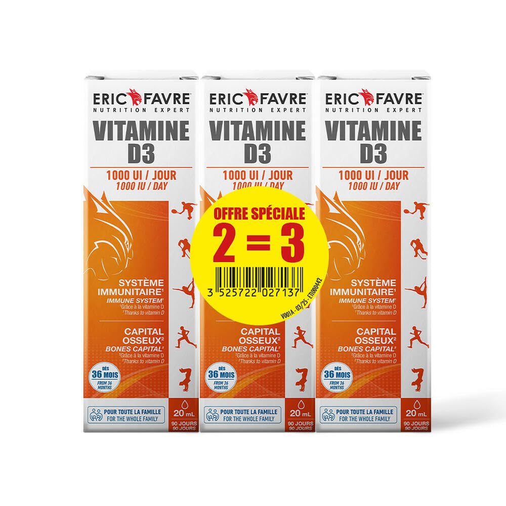 ADAPTEE A TOUS - 10 gouttes de cette vitamine D3 Eric Favre vous apportera 5 microgrammes de vitamines D3, soit 1 3 de la dose journalière recommandée pour l'adulte. UNE ABSORPTION FACILITEE - La vitamine D3 contenue dans ces compte-gouttes Eric Favre est alliée à la vitamine E et à l'huile de tournesol, facilitant ainsi son assimilation par le corps. PRENEZ SOIN DE VOTRE OSSATURE ! La vitamine D3 contribue à l'absorption du calcium et du phosphore de l'alimentation dans la circulation du sang. Elle est indispensable à la santé des os et des dents à tout âge !. SOUTIEN LE SYSTEME IMMUNITAIRE - Se supplémenter, c'est soutenir son système immunitaire, notamment en hiver et en période peu ensoleillée. VITAMINE D3, LA VITAMINE DU SOLEIL - La Vitamine D3, ou Vitamine du Soleil, est synthétisée par le corps humain lorsque la peau est exposée aux rayons UVB du soleil. Elle joue un rôle important dans l'immunité, la minéralisation osseuse et assure un fonctionnement musculaire normal.