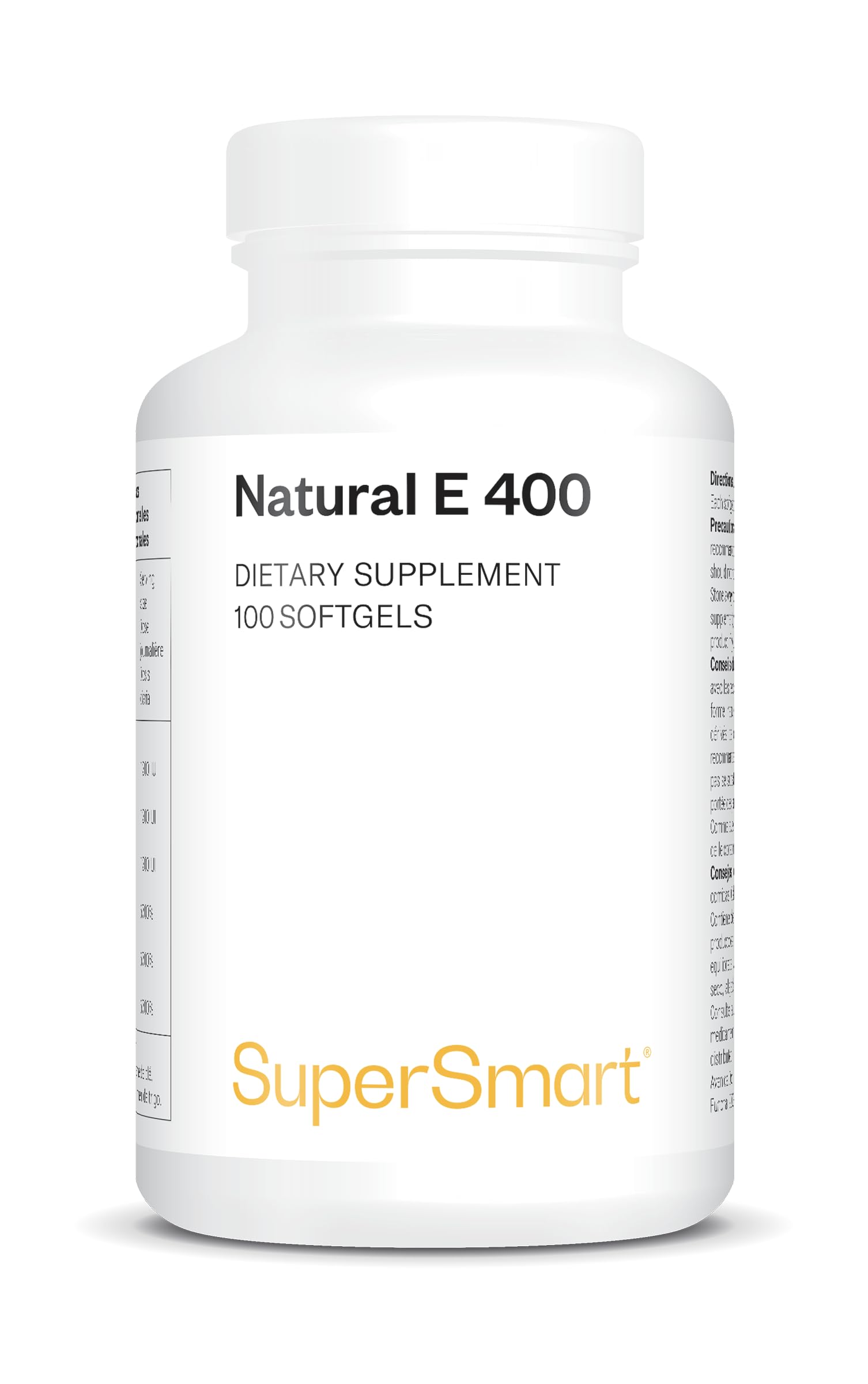 SATISFACTION GUARANTEED: We strive to offer you a range of highly effective products, along with exceptional customer service. If you have any questions or concerns, please don't hesitate to contact us at any time. We're here to help you become the best version of yourself. DIRECTIONS FOR USE: Take 1 softgel daily with a meal. This product is a nutritional supplement and should not be used as a substitute for a balanced and varied diet or a healthy lifestyle. Keep out of reach of children, away from light, heat, and moisture. NATURAL INGREDIENTS: Formulated with vitamin E obtained from natural sources such as vegetable oils and nuts. At Supersmart, we choose raw materials rich in active ingredients. We also prioritize eco-responsible practices and natural excipients. A POWERFUL ANTIOXIDANT VITAMIN E: Scientific studies have proven that vitamin E and tocopherols act as potent antioxidants to protect your cells from the harmful effects of free radicals. This supplement strengthens your immune system, promotes radiant skin, and protects your heart and eyes! Vitamin E helps fight skin aging. ? SUPERSMART: With over 30 years of expertise, we are one of the leading brands in Europe to market food supplements. Our formulas are developed by an in-house team of specialists. With hundreds of thousands of satisfied customers, SUPERSMART is a key player in the nutritional supplement market.SATISFACTION GARANTIE : Nous mettons tout en œuvre pour vous proposer une gamme de produits hautement efficaces, tout en vous offrant un service client exceptionnel. Si vous avez des questions ou des préoccupations, n'hésitez pas à nous contacter à tout moment. Nous sommes là pour vous aider à devenir la meilleure version de vous-même. CONSEIL D'UTILISATION : Prendre 1 softgel par jour au cours d'un repas. Ce produit est un supplément nutritionnel et ne doit pas être utilisé en remplacement d'une alimentation équilibrée et variée, ni d'un mode de vie sain. Conservez hors de portée des enfants, à l'abri de la lumière, de la chaleur et de l'humidité. DES INGRÉDIENTS NATURELS : Formulée avec de la vitamine E obtenue à partir de sources naturelles comme les huiles végétales et les noix. Chez Supersmart, nous choisissons des matières premières riches en ingrédients actifs. Nous privilégions aussi les démarches éco-responsables et les excipients naturels. UNE VITAMINE E AU FORT POUVOIR ANTIOXYDANT : Des études scientifiques ont prouvé que la vitamine E et les tocophérols agissent comme de puissants antioxydants pour protéger vos cellules des méfaits des radicaux libres. Ce supplément renforce votre système immunitaire, favorise une peau éclatante et protège votre cœur et vos yeux ! La Vitamine E participe à la lutte contre le vieillissement cutané. ? SUPERSMART : 30 ans d'expertise, nous sommes l'une des premières marques en Europe à commercialiser des compléments alimentaires. Nos formules sont mises au point par une équipe de spécialistes en interne. Avec des centaines de milliers de clients satisfaits, SUPERSMART figure comme un acteur incontournable de la supplémentation nutritionnelle.Vitamine E Naturelle - (D-Alpha Tocophérol) - Bonne Santé de la Peau et des Cheveux - Aide à Protéger les Cellules Contre le Stress Oxydatif - 100 Softgels - Sans Gluten - SuperSmart