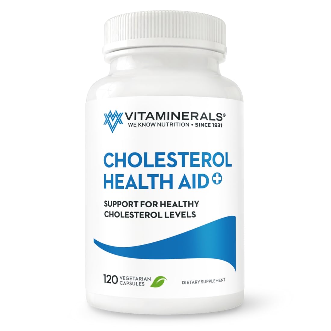 Vitaminerals 1256 Cholesterol Health Aid Plus, designed to help support healthy cholesterol levels with Niacin, CoQ-10, Phytolestrol Complex, Red Rice Yeast, Garlic, Olive Leaf, Citrus bergamont extract. Veggie Capsules