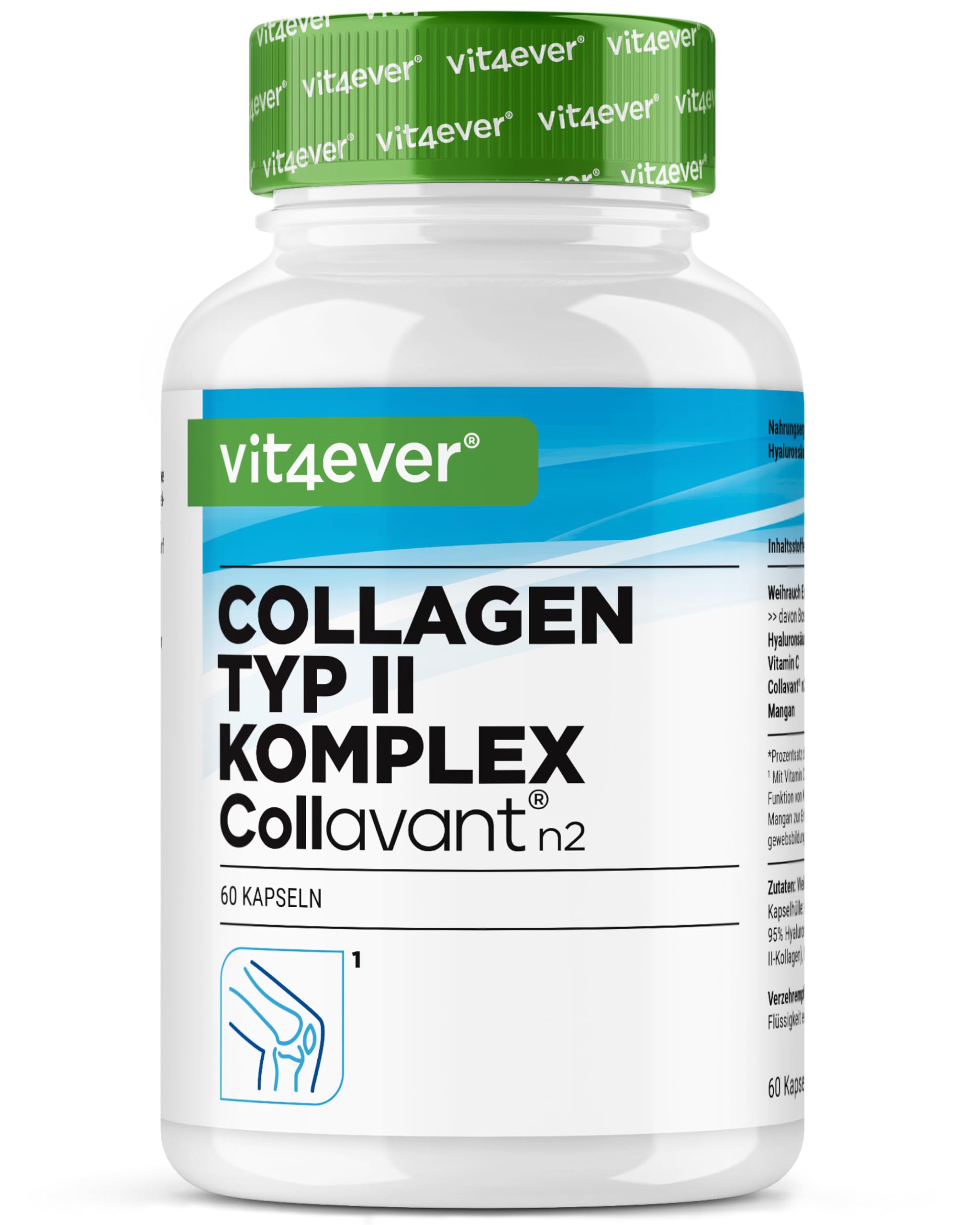 Collagen capsules, 60 count. INGREDIENTS Frankincense extract, coating agent: hydroxypropyl methylcellulose (vegetable), sodium hyaluronate, ascorbic acid, native type II collagen, manganese(II) gluconate, anti-caking agent: stearic acid. DIRECTIONS FOR USE Take 1 capsule daily, unchewed, with plenty of liquid, preferably with a meal. SAFETY WARNING Food supplements should not be used as a substitute for a balanced, varied diet and a healthy lifestyle. Do not exceed the recommended daily dose. Store closed in a cool, dry place, protected from light, and out of the reach of young children. Food supplements should not be used as a substitute for a balanced, varied diet and a healthy lifestyle. Do not exceed the stated recommended daily dose. Store closed in a cool, dry place, protected from light, and out of the reach of young children. See moreVIT4EVER QUALITY: The vit4ever range offers a wide selection of nutritional supplements for different needs. Our products are made from high-quality raw materials and produced exclusively in carefully selected EU factories to guarantee consistent, high quality. vit4ever - German brand quality since 2016. OUR PHILOSOPHY: We believe that true quality starts with care. That is why we develop our products with responsible production processes and carefully selected ingredients. Every Vit4ever product stands for transparency, trust and sustainability – reliable support for your daily life. CLEAR INGREDIENTS: Our capsules are free from added flavors, colorants or stabilizers and do not contain gelatin, because the capsule is completely vegetable. The formula is also GMO-free, lactose-free and gluten-free. Where technically useful, we consciously avoid unnecessary additives for a product that is as pure as possible. WITH PATENTED BRANDING INGREDIENT: Contains Collavant n2, a high-quality native collagen type II, extracted from cartilage. Collagen type II is a body's own structural protein that naturally occurs in cartilage tissue. As a brand ingredient, Collavant n2 stands for tested quality, clear standardization and a consistent composition from batch to batch. HIGH-DOSE COLLAGEN TYPE II COMPLEX: 60 capsules with Collavant n2 native collagen type II, high-dose frankincense extract, hyaluronic acid, vitamin C and manganese. The formula is thoughtfully combined and clearly dosed for daily supplementation for joints, cartilage and bones. Vitamin C contributes to normal collagen formation for the normal functioning of cartilage and bones manganese contributes to the maintenance of normal bones.Collageen type II-complex – met Collavant n2 native collageen, wierook-extract, hyaluronzuur, vitamine C, mangaan voor botten, kraakbeen en gewrichten Collageencapsules, 60 stuks. INGREDIËNTEN Wierookextract, coatingmiddel: hydroxypropylmethylcellulose (plantaardig), natriumhyaluronaat, ascorbinezuur, natief type II collageen, mangaan(II) gluconaat, antiklontermiddel: stearinezuur. GEBRUIKSAANWIJZING Neem dagelijks 1 capsule ongekauwd in met voldoende vloeistof, bij voorkeur bij de maaltijd. VEILIGHEIDSWAARSCHUWING Voedingssupplementen mogen niet worden gebruikt ter vervanging van een evenwichtige, gevarieerde voeding en een gezonde levensstijl. De aanbevolen dagelijkse hoeveelheid mag niet overschreden worden. Gesloten, koel, droog, beschermd tegen licht en buiten bereik van kleine kinderen bewaren.Voedingssupplementen mogen niet worden gebruikt als vervanging voor een evenwichtige, gevarieerde voeding en een gezonde levensstijl. De aangegeven aanbevolen dagelijkse inname mag niet worden overschreden. Gesloten, koel, droog, beschermd tegen licht en buiten het bereik van kleine kinderen bewaren. Meer bekijkenVIT4EVER KWALITEIT: Het vit4ever-assortiment biedt een brede selectie voedingssupplementen voor verschillende behoeften. Onze producten worden gemaakt van hoogwaardige grondstoffen en uitsluitend geproduceerd in zorgvuldig geselecteerde EU-fabrieken om een constante, hoge kwaliteit te garanderen. vit4ever - Duitse merkkwaliteit sinds 2016. ONZE FILOSOFIE: Wij geloven dat echte kwaliteit begint met zorg. Daarom ontwikkelen wij onze producten met verantwoorde productieprocessen en zorgvuldig geselecteerde ingrediënten. Elk Vit4ever-product staat voor transparantie, vertrouwen en duurzaamheid – een betrouwbare ondersteuning voor je dagelijks leven. HELDERE INGREDIËNTEN: Onze capsules zijn vrij van toegevoegde aroma's, kleurstoffen of stabilisatoren en bevatten geen gelatine, omdat de capsule volledig plantaardig is. De formule is bovendien GMO-vrij, lactosevrij en glutenvrij. Waar technisch zinvol, vermijden wij bewust onnodige hulpstoffen voor een zo puur mogelijk product. MET GEPATENTEERD MERKINGREDIËNT: Bevat Collavant n2, een hoogwaardig native collageen type II, gewonnen uit kraakbeen. Collageen type II is een lichaamseigen structuur-eiwit dat van nature voorkomt in kraakbeenweefsel. Als merkingrediënt staat Collavant n2 voor geteste kwaliteit, duidelijke standaardisering en een consistente samenstelling van batch tot batch. HOOG GEDOSEERD COLLAGEEN TYPE II-COMPLEX: 60 capsules met Collavant n2 native collageen van type II, hoog gedoseerd wierook-extract, hyaluronzuur, vitamine C en mangaan. De formule is doordacht gecombineerd en duidelijk gedoseerd voor dagelijkse aanvulling voor gewrichten, kraakbeen en botten. Vitamine C draagt bij tot de normale collageenvorming voor de normale werking van kraakbeen en botten mangaan draagt bij tot de instandhouding van normale botten.