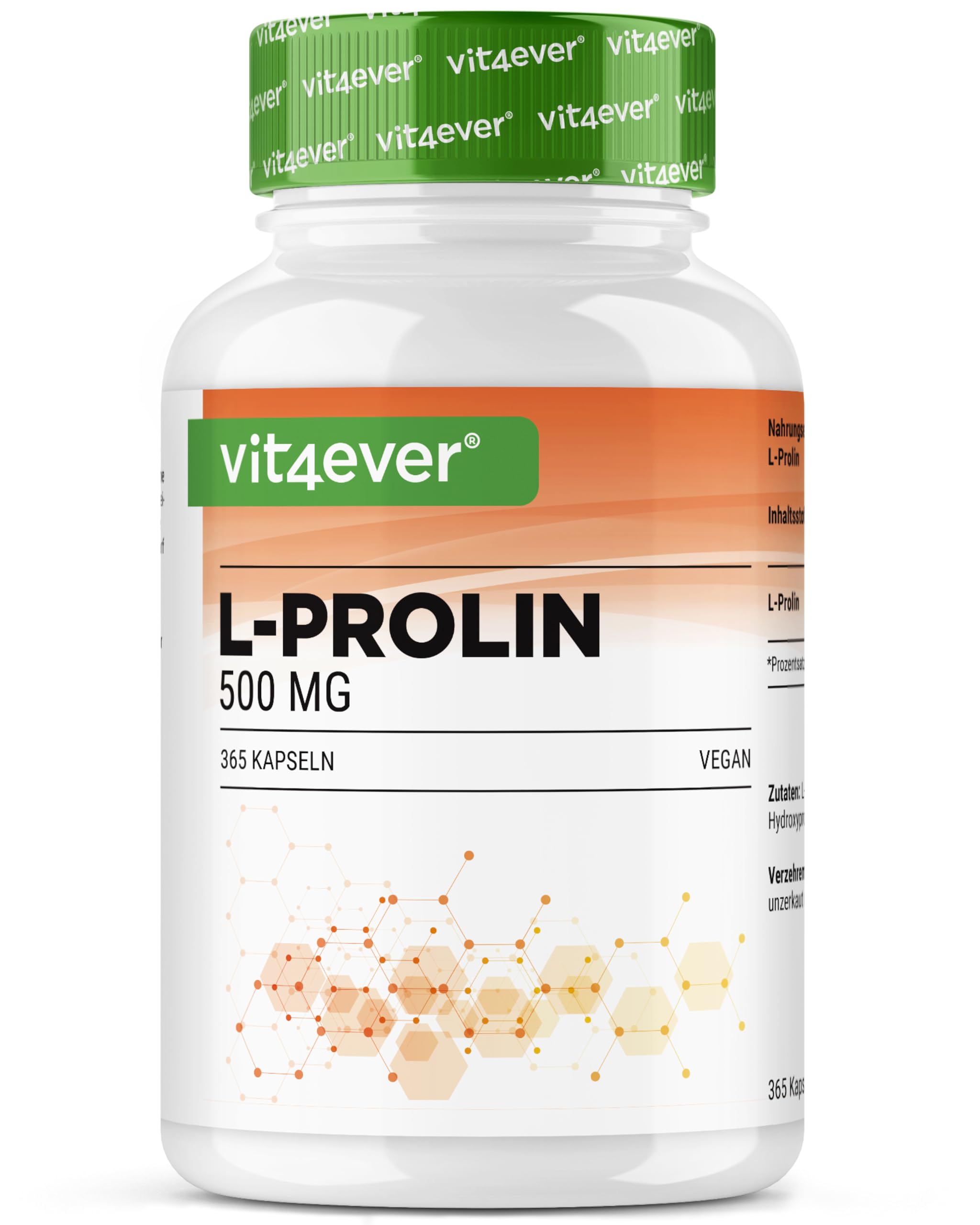 PRODUCTION SATISFACTION: At Vit4ever you will find an extensive range of nutritional supplements made from high-quality raw materials in EU-certified factories in Germany and the Netherlands. Your satisfaction is our top priority. If you have any questions or need support, we are here to help. OUR PHILOSOPHY: Our passion for health and wellness drives us to develop each product with the utmost care. We combine selected ingredients with a responsible production process - for supplements you can rely on day after day. VEGAN WITHOUT ADDITIVES: Our L-proline capsules are of the highest quality. They are purely vegetable, a natural product and completely free of additives such as magnesium stearate, flavourings, colourants, stabilizers and gelatin. They are also GMO-free, lactose-free, gluten-free and preservative-free. PREMIUM RAW MATERIAL: L-proline is an important building block for collagen. Our 100 vegan amino acid is obtained by fermentation of GMO-free corn syrup, is purely vegetable, guaranteed glucose-free and free of additives. Each capsule provides 500 mg of pure L-proline of the highest quality and particularly high purity. HIGH DOSE OF L-PROLINE: Two capsules provide a total of 1000 mg L-proline, a proteinogenic amino acid that is a component of many protein structures and is therefore a conscious supplement for your daily life. A can contains 365 capsules and has a shelf life of six months if you take two capsules per day.L-Proline - 365 capsules - Hooggedoseerd met 1000mg per dagelijkse portie - Puur aminozuur verkregen door fermentatie - Geen toevoegingen, veganistischPRODUCTIE SATISFACTIE: Bij Vit4ever vindt u een uitgebreid assortiment voedingssupplementen gemaakt van hoogwaardige grondstoffen in EU-gecertificeerde fabrieken in Duitsland en Nederland. Uw tevredenheid is onze topprioriteit. Als je vragen hebt of ondersteuning nodig hebt, staan we voor je klaar. ONZE FILOSOFIE: Onze passie voor gezondheid en welzijn drijft ons ertoe om elk product met de grootste zorg te ontwikkelen. We combineren geselecteerde ingrediënten met een verantwoord productieproces - voor supplementen waar je dag na dag op kunt vertrouwen. VEGAN ZONDER ADDITIVEN: Onze L-proline capsules zijn van de hoogste kwaliteit. Ze zijn puur plantaardig, een natuurlijk product en volledig vrij van toevoegingen zoals magnesiumstearaat, smaakstoffen, kleurstoffen, stabilisatoren en gelatine. Ze zijn ook GMO-vrij, lactosevrij, glutenvrij en vrij van conserveringsmiddelen. PREMIUM RAUW MATERIAAL: L-proline is een belangrijke bouwsteen voor collageen. Ons 100 veganistische aminozuur wordt verkregen door fermentatie van GMO-vrije maïssiroop, is puur plantaardig, gegarandeerd glucosevrij en vrij van toevoegingen. Elke capsule levert 500 mg pure L-proline van de hoogste kwaliteit en bijzonder hoge zuiverheid. HOOGDOSERING L-PROLINE: Twee capsules leveren in totaal 1000 mg L-proline, een proteinogeen aminozuur dat een bestanddeel is van veel eiwitstructuren en dus een bewust supplement vormt voor je dagelijks leven. Een blikje bevat 365 capsules en is bij inname van twee capsules per dag zes maanden houdbaar.