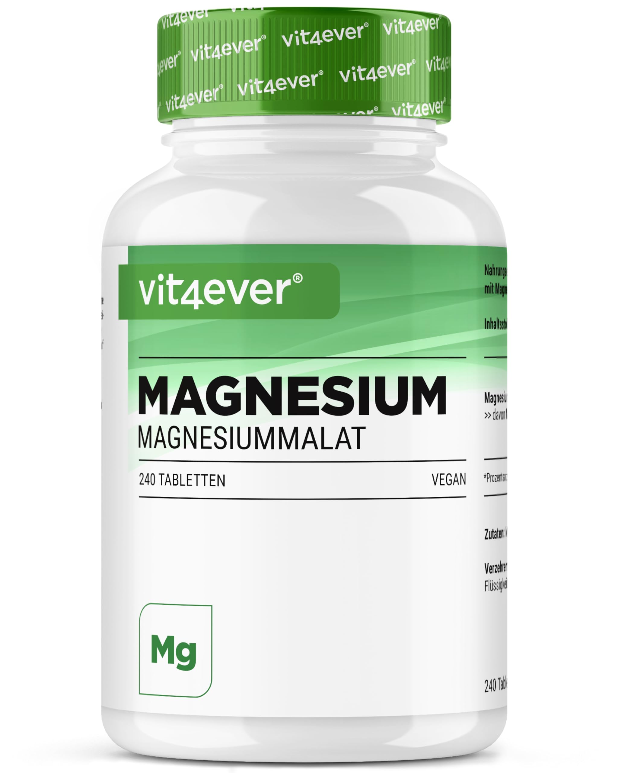 PRODUCTION SATISFACTION: At Vit4ever you will find an extensive range of nutritional supplements made from high-quality raw materials in EU-certified factories in Germany and the Netherlands. Your satisfaction is our top priority. If you have any questions or need support, we are here to help. APPLICATION: 3 tablets per day. CLEAR INGREDIENTS: Every ingredient we use is listed directly on the label. We strive for absolute transparency. Our tablets are based exclusively on plant-based ingredients, are 100 vegan and contain no additives. They do not contain PEGs, carrageenan, artificial flavors or magnesium stearate. WELL BORROWED HIGHLY BIOAVAILABLE: Magnesium malate is an organic magnesium compound in which magnesium is bound to malic acid (fruit acid chelate). This form of magnesium is characterized by its excellent tolerability and high bioavailability. 3 MONTHS SUPPLY: 240 vegan tablets with a particularly high dosage of 2000 mg pure magnesium malate per daily portion (3 tablets), including 300 mg elemental magnesium. Practical supply of 3 months when taking 3 tablets per day. Premium magnesium malate with a purity of 98 .Magnesiummalaat - 240 tabletten met 2000 mg magnesiummalaat per dagelijkse portie - Hoge biologische beschikbaarheid hoge dosering - Zonder ongewenste toevoegingen - VeganistischRODUCTIE SATISFACTIE: Bij Vit4ever vind je een uitgebreid assortiment voedingssupplementen gemaakt van hoogwaardige grondstoffen in EU-gecertificeerde fabrieken in Duitsland en Nederland. Uw tevredenheid is onze topprioriteit. Als je vragen hebt of ondersteuning nodig hebt, staan we voor je klaar. TOEPASSING: 3 tabletten per dag. DUIDELIJKE INGREDIËNTEN: Elk ingrediënt dat we gebruiken staat direct op het etiket. We streven naar absolute transparantie. Onze tabletten zijn uitsluitend gebaseerd op plantaardige ingrediënten, zijn 100 veganistisch en bevatten geen additieven. Ze bevatten geen PEG's, carrageen, kunstmatige smaakstoffen of magnesiumstearaat. GOED GEBOORGD ZEER BIOBESCHIKBAAR: Magnesiummalaat is een organische magnesiumverbinding waarin magnesium gebonden is aan appelzuur (fruitzuurchelaat). Deze vorm van magnesium wordt gekenmerkt door zijn uitstekende verdraagbaarheid en hoge biologische beschikbaarheid. 3 MAANDEN LEVERING: 240 veganistische tabletten met een bijzonder hoge dosering van 2000 mg zuiver magnesiummalaat per dagelijkse portie (3 tabletten), inclusief 300 mg elementair magnesium. Praktische voorraad van 3 maanden bij inname van 3 tabletten per dag. Premium magnesiummalaat met een zuiverheid van 98 .