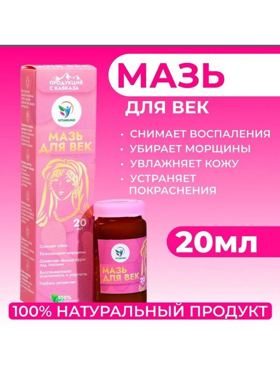 Vitamuno eye ointment effectively combats inflammation and wrinkles thanks to its unique formula, which includes beeswax, chamomile oil, castor oil, amaranth oil, and other natural ingredients. Beeswax protects cells from free radicals, while chamomile oil improves circulation and helps reduce dark circles. Castor oil actively eliminates dark circles under the eyes, and amaranth oil, rich in antioxidants, promotes cell renewal and regeneration. Honey relieves inflammation and cleanses the skin of toxins, and wheat germ oil prevents the appearance of fine wrinkles. Corn kernel oil moisturizes and improves skin elasticity, while sea buckthorn oil improves metabolism. Nettle smoothes wrinkles and restores cells, and propolis oil eliminates redness and stimulates collagen production. Apply the ointment around the eyes with light movements without massaging for best results.