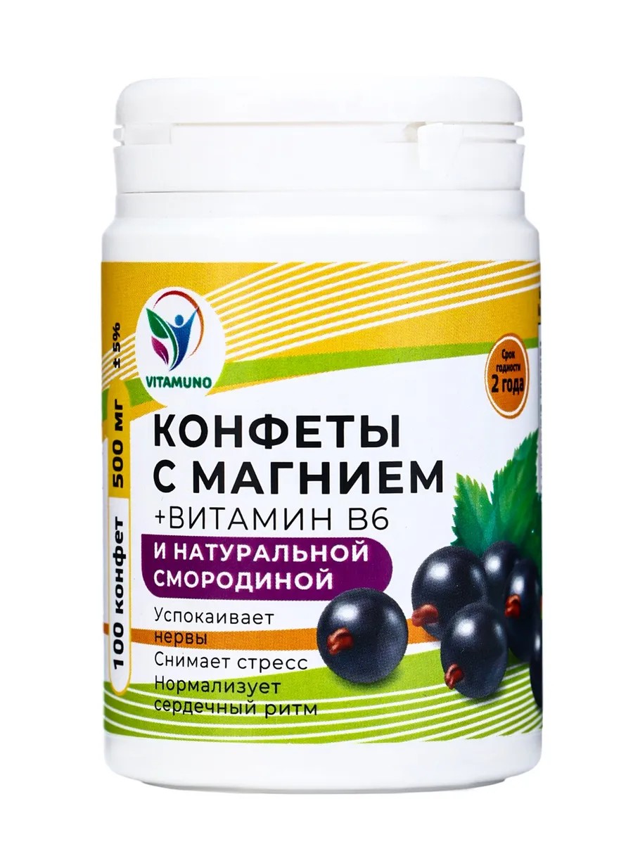 Магний оказывает мягкое успокаивающее действие, нормализует сон и сердечные ритмы, снимает спазм мышц.Состав: цитрат магния, смородина сублимиро- ванная, фруктоза, диоксид кремния, стеарат магния, микроцеллюлоза, пиридоксина гидро- хлорид (витамин В6).Масса нетто 50 г, Масса брутто 63 г, таблетки 500 мг.Применение: по 3 таблетки в день, во время еды. Продолжительность курса 1 - 1,5 месяца. Перед началом приёма проконсультируйтесь со специалистом.Противопоказания: индивидуальная непереносимость. Беременным и кормящим женщинам.
