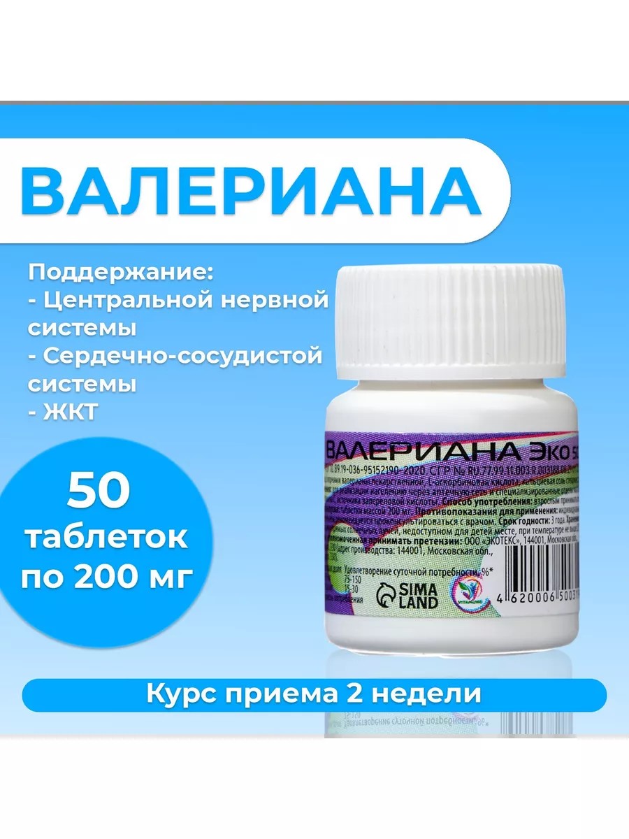 Валериана Экотекс для поддержания физиологических функций центральной нервной и сердечно-сосудистой систем, ЖКТ. Рекомендуется в качестве дополнительного источника витамина B6, валереновой кислоты.