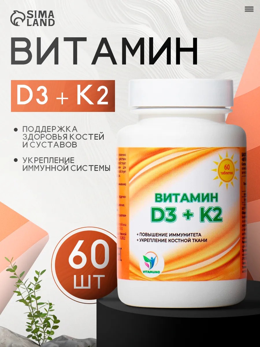 | Комплектация | Витамин D3 + K2 Vitamuno, 60 таблеток; витамин д3; Витамин Д; витамины для женщин; витамины для мужчин; витамины для детей; Витамин Д3 К2; витамин D; Витамин D3 |