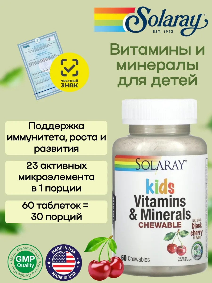 Детские витамины и минералы Соларэй - вкусные жевательные таблетки со вкусом вишни для детей, они поддерживают общее состояние здоровья и способствуют правильному росту и развитию.