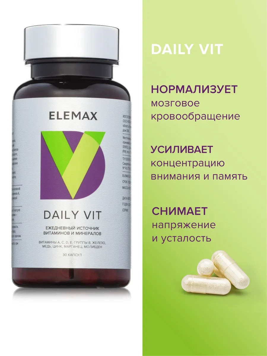 ELEMAX DAILY VIT contains B vitamins, vitamins A, C, D, E, as well as calcium, magnesium, iron and other trace minerals that play a key role in maintaining healthy bones, the immune system, skin and hair. Regular use of these multivitamins can help improve energy levels, reduce fatigue and improve overall well-being.