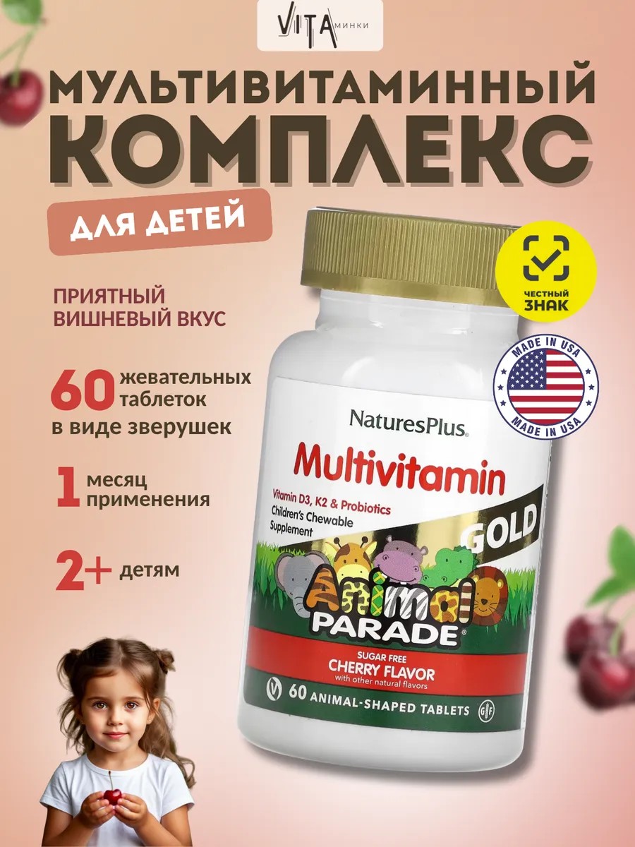 NaturesPlus Animal Parade Gold Мультивитамины для детей Вишня, 60 таблеток – комплекс витаминов и минералов, поддерживающие здоровый рост и развитие ребенка.