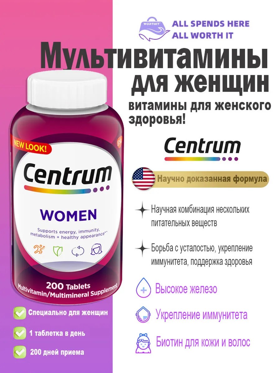 | Included | multivitamins; multiminerals; vitamins for women; dietary supplement; immunity; effectiveness; results; from A to zinc; for energy and nutrient storage; antioxidants; centrum; women's |