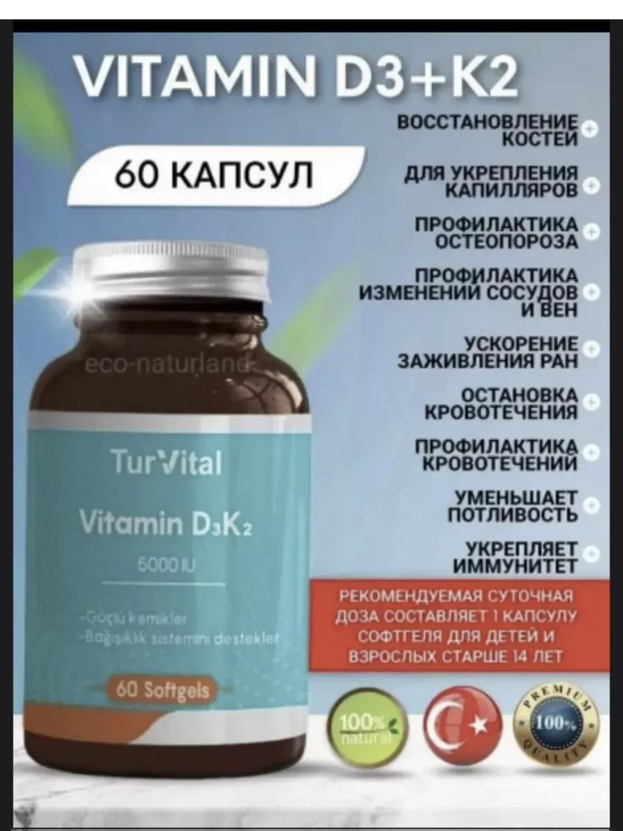 Витамин Д2+К3 TurVital Турция 120 капсул. Ищете естественное повышение иммунитета и настроения? Тогда может остановить свои поиски и смотрите дальше, потому что у нас есть именно это! Капсулы витамина D3 и K2 ТурВитал — это пищевая добавка, которая помогает повысить уровень витамина D у людей, которым требуется его больше или у которых его не хватает. Наша формула, витамин D3 K2 в капсулах, содержит ту же биологически активную форму витамина Д, которая вырабатывается организмом в результате пребывания на солнце без воздействия солнечных лучей. Использование витамина D3 и витамина K2 в комбинации увеличивает эффективность обоих витаминов. Ингредиенты в витамине Д3 К2 5000 МЕ были тщательно отобраны из-за его положительного действия на иммунные клетки. Это помогает поддерживать иммунное здоровье, способствует усвоению кальция для поддержания здоровья костей и зубов. Это также помогает поддерживать функции мышц и здоровье сердечно-сосудистой системы. профилактика остеопороза повышение иммунитета, защитной силы организма и мышечной силы витаминный комплекс улучшает работу сердца укрепляет кости и зубы укрепление капилляров. витамины Д3 К2 для иммунитета