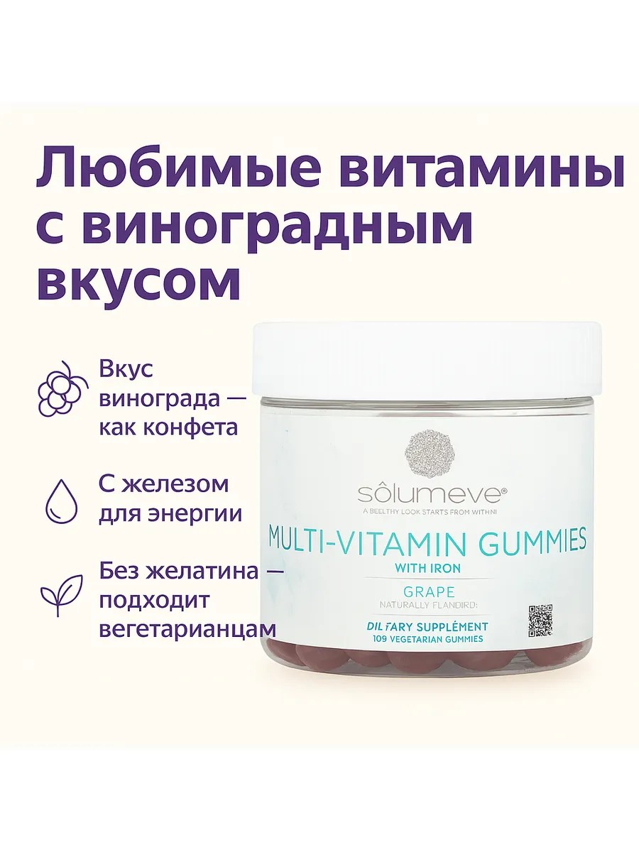 Solumeve Multi-Vitamin Gummies with Iron — вегетарианские жевательные мультивитамины с железом и виноградным вкусом, не содержащие желатин, глютен, ГМО, искусственные ароматизаторы и красители. Формула разработана для ежедневной поддержки организма и восполнения дефицита витаминов и минералов, включая железо, которое способствует нормальному кроветворению и повышению уровня энергии. Комплекс витаминов A, C, D, E, группы B и фолиевой кислоты укрепляет иммунитет, улучшает обмен веществ, поддерживает здоровье кожи, волос и ногтей, а также общее самочувствие. Жевательная форма делает приём удобным и приятным, особенно для тех, кому сложно глотать таблетки. Добавка легко усваивается и подходит для ежедневного применения взрослыми и подростками. Рекомендуется принимать в рамках сбалансированного рациона для укрепления иммунной системы, повышения работоспособности и восполнения питательных веществ, особенно при повышенных нагрузках, неполноценном питании или в период восстановления.
