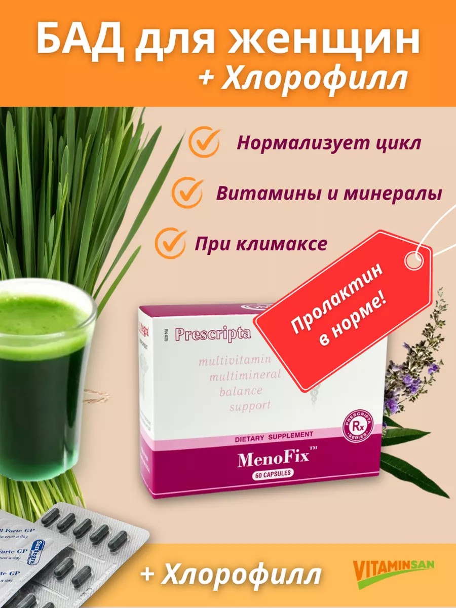Комплекс витамины для женщин МеноФикс и Хлорофилл Форте Santegra необходимы для иммунитета. Капсулу Сhlorophyll Forte можно растворить в воде и использовать как хлорофилл жидкий пищевой для приема внутрь и для местного применения как хлорофилл жидкий.