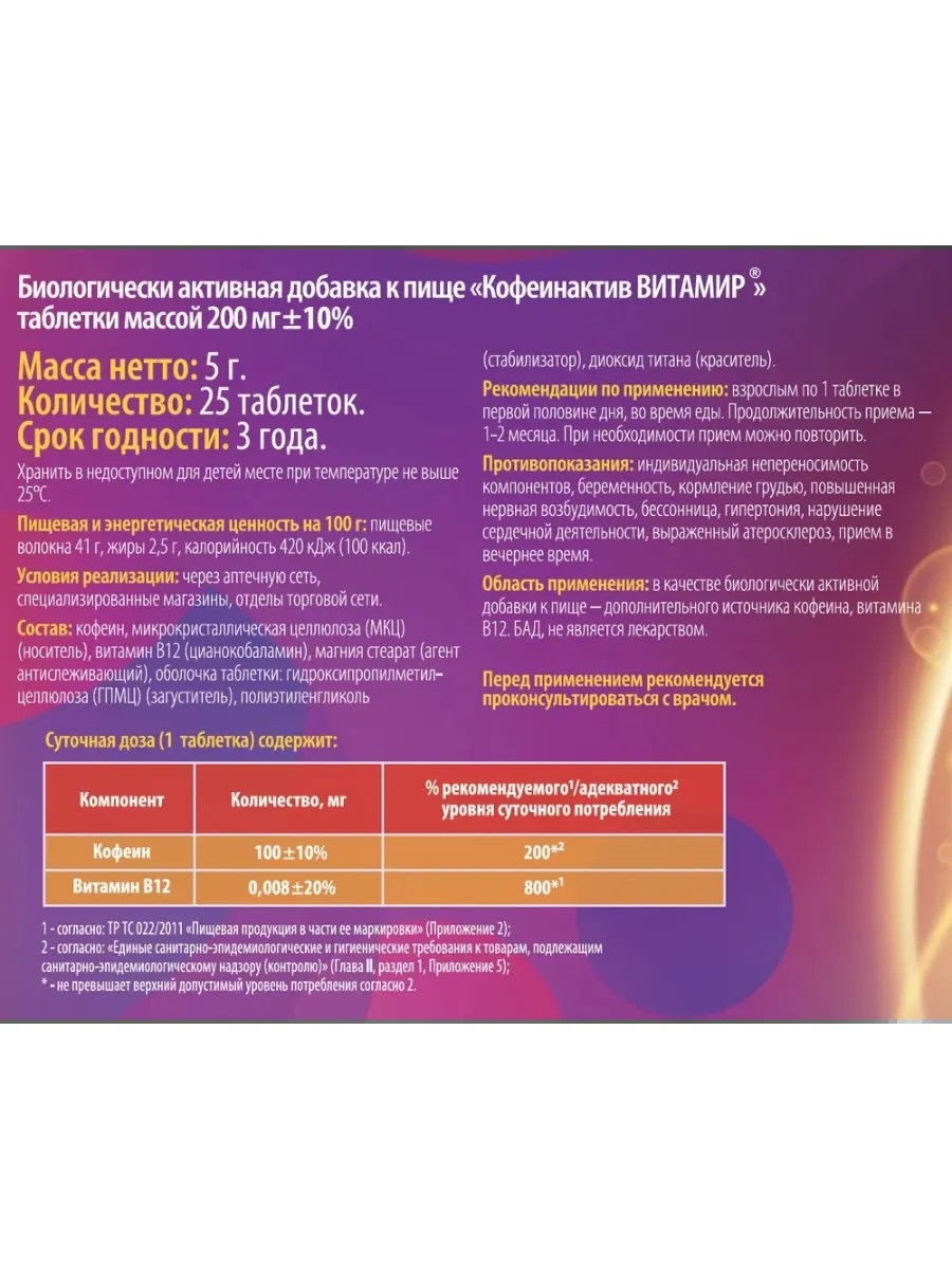 Торговое наименованиебиологически активная добавка к пище "Кофеинактив ВИТАМИР® " (таблетки, покрытые оболочкой, массой 200 мг±10%)
