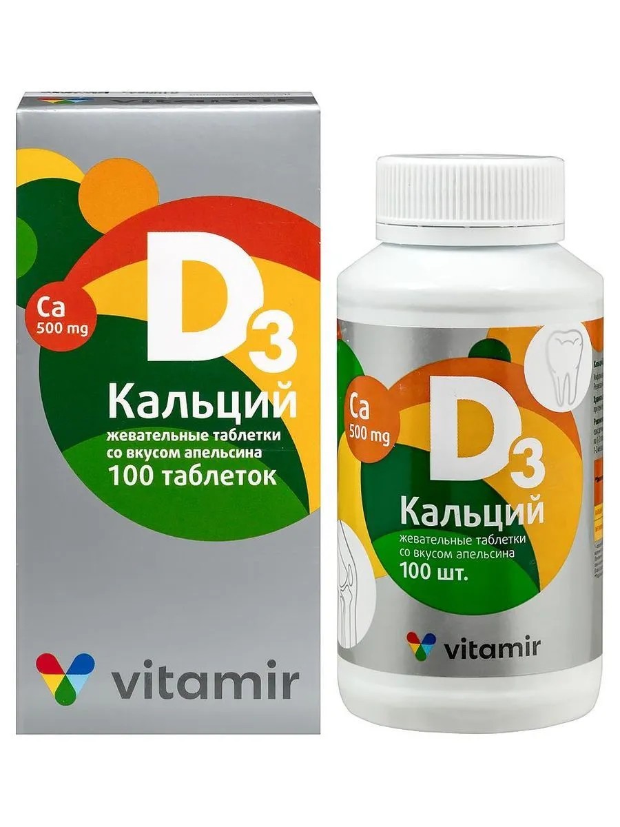 Calcium D3 Vitamir N100 Chewable Tablets, 1.7g, Orange Flavor. Additional Source of Calcium and Vitamin D3. As a Dietary Supplement. Calcium, Vitamin D3, Excipients. For Sale to the Population as a Dietary Supplement - Additional Source of Calcium and Vitamin D3 (100 IU Per Tablet). (Hereinafter referred to as in the Appendix). Biologically Active Substances: Vitamin D3 - 2.5 ± 20% mcg/tablet, Calcium - 500 ± 10% mg/tablet. -