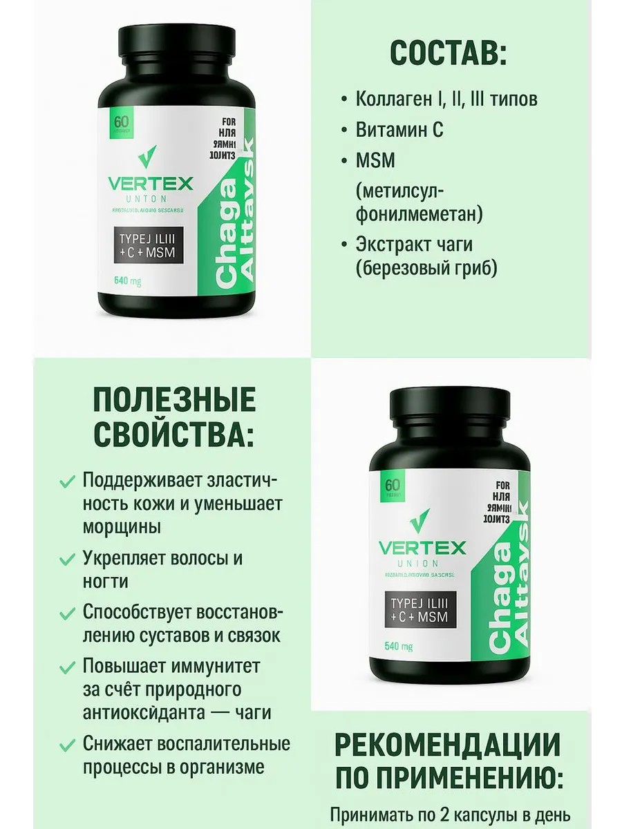 CHAGA ALTAYSK от VERTEX UNION — это натуральная пищевая добавка, созданная для поддержания здоровья кожи, волос и суставов. В состав входят коллагены типов I, II и III, витамин C и MSM — мощные компоненты для омоложения и восстановления организма.